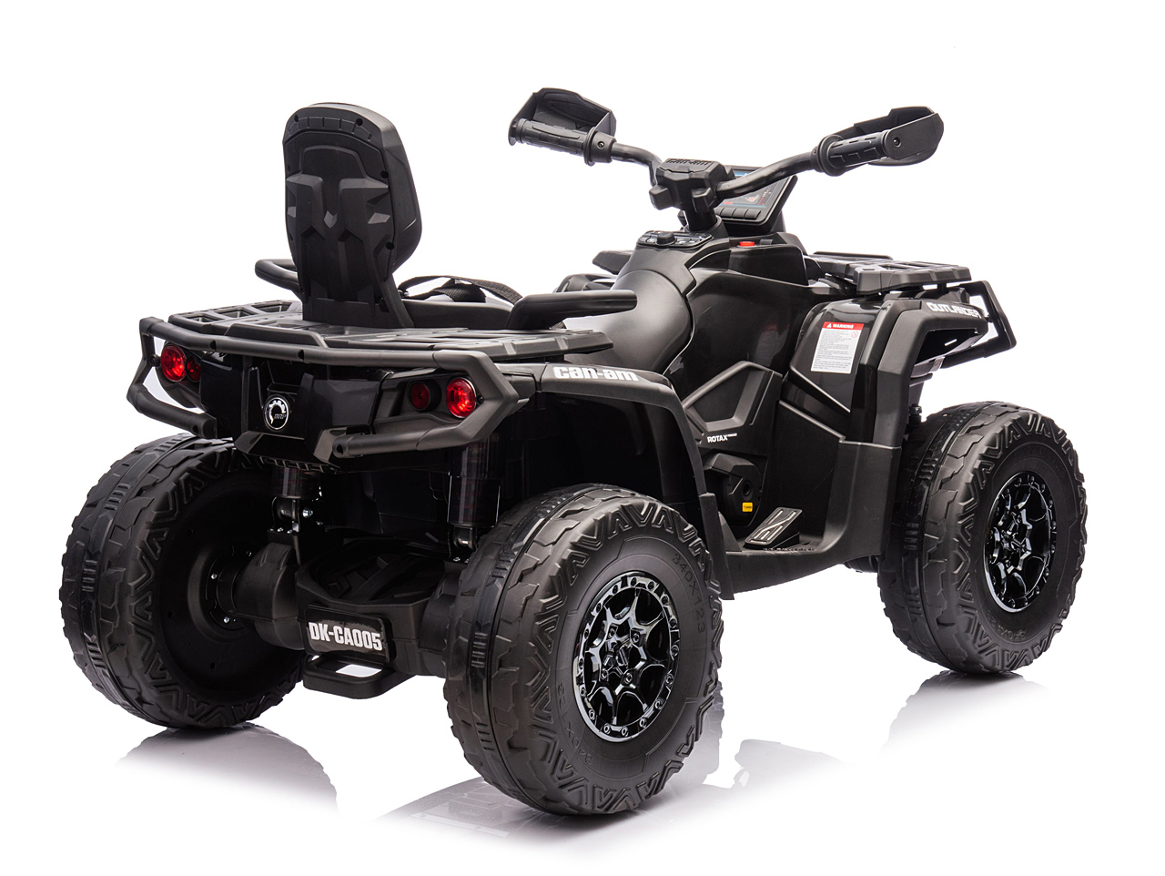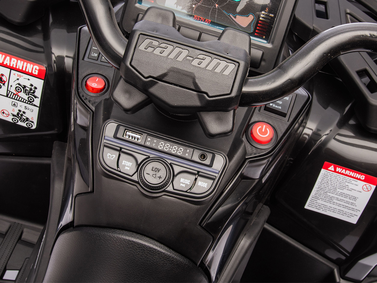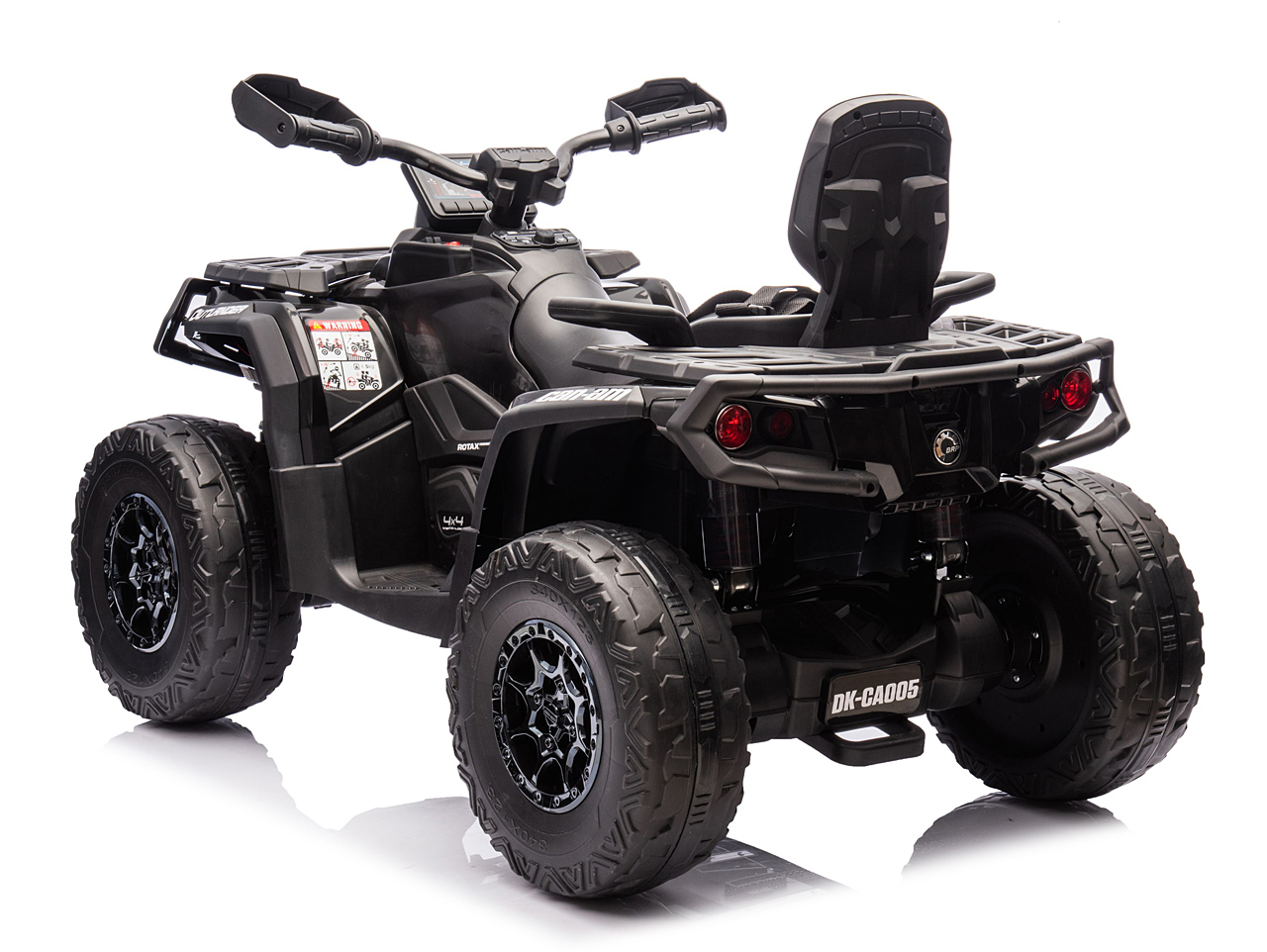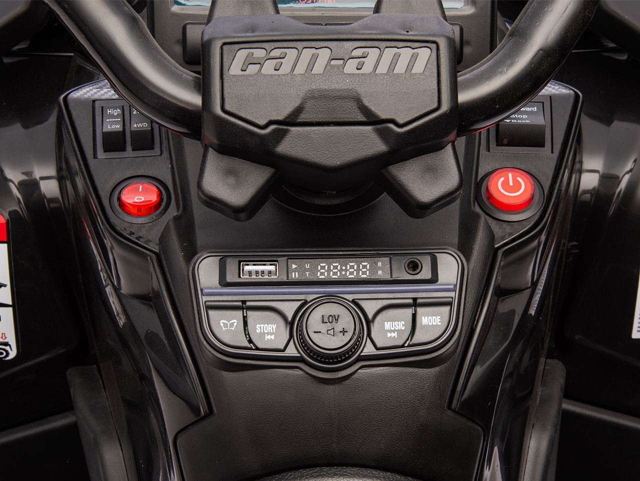 4 motory 24V/200W, prenosný box s batériou 24V/7Ah, pohon všetkých kolies, nosnosť 50 kg, vhodná aj pre jazdu dvoch detí, 2 rýchlosti, plynulý rozjazd, EVA kolesá na ložiskách, polstrovaná sedačka z eko kože, Bluetooth, USB, AUX, FM rádio, predné a zadné LED svetlá, odpruženie zadnej nápravy, ukazovateľ batérie (voltmeter), zvukové efekty, klaksón, licencia Can-Am Celý popis