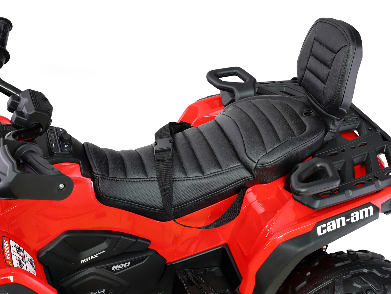 Elektrická štvorkolka Can-Am Outlander je vybavená veľmi pohodlnou polstrovanou sedačkou z eko kože. Váš malý rally pretekár síce nie je z cukru, ale deti sú na diskomfort citlivejšie ako dospelí. Čím pohodlnejšie sa mu bude sedieť, tým menej sťažností si vypočujete. Menšie deti sa budú aj pri jazde po hrboľoch cítiť istejšie vďaka bezpečnostnému pásu, takže sa nemusíte ľakať, keď to s nimi bude trochu hádzať. Ono to ale veľmi hádzať nebude, pretože odpružená zadná náprava tejto elektrickej štvorkolky je skutočný top. Nerovnosti zdolá bez žmurknutia svetlometom.