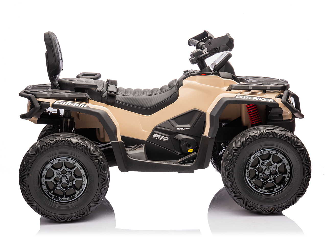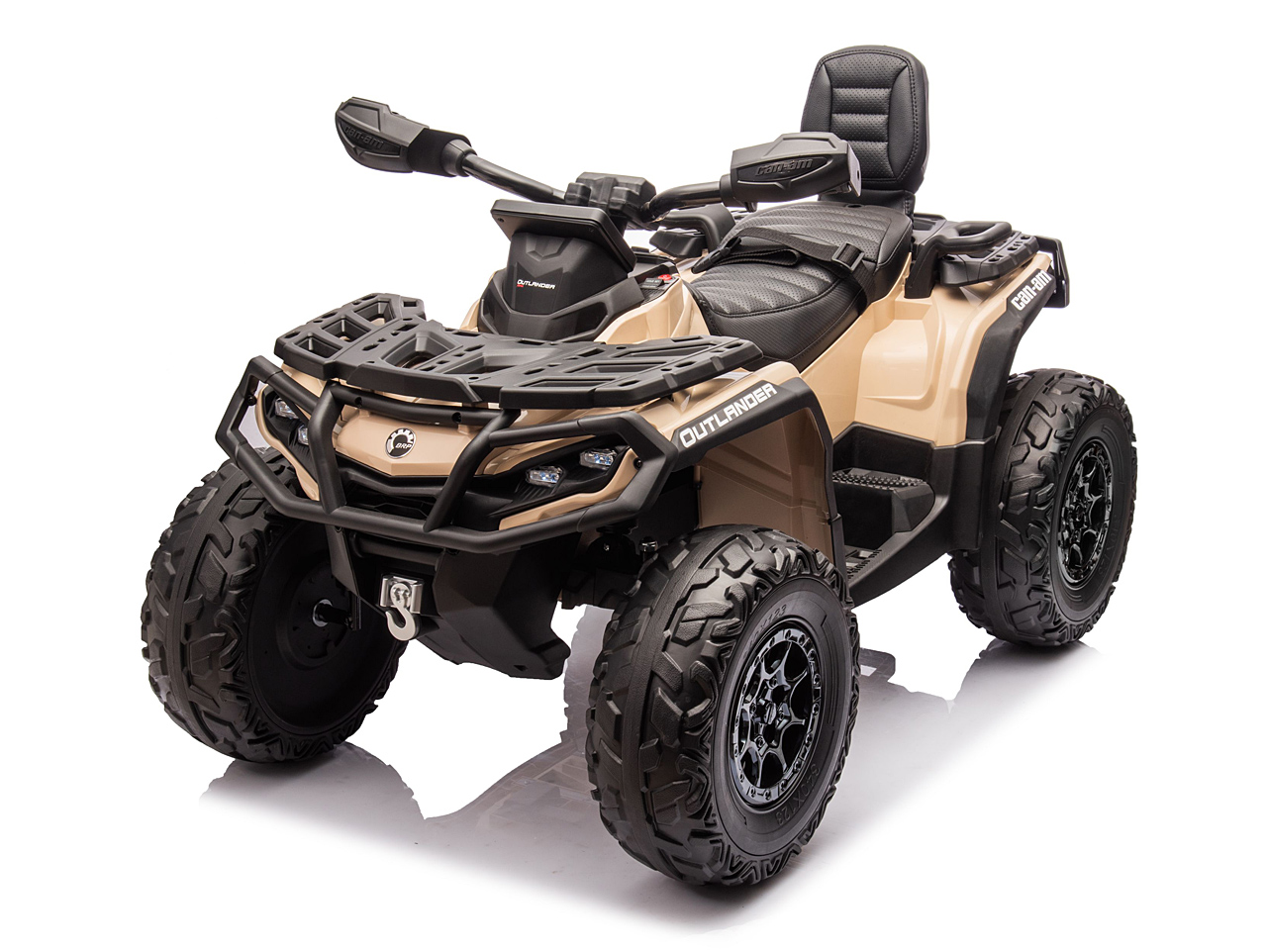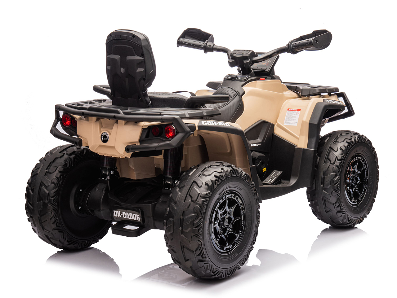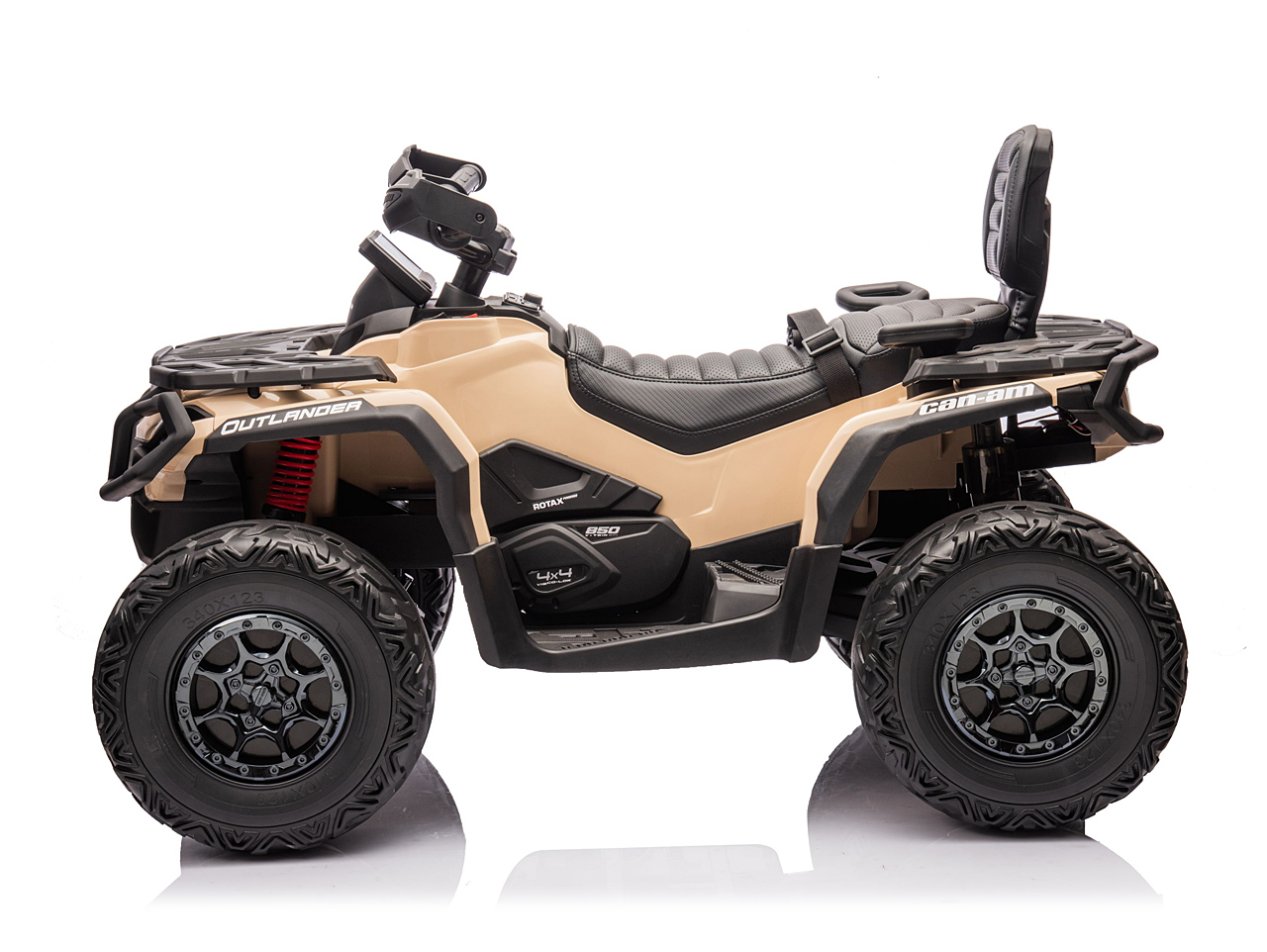 4 motory 24V/200W, prenosný box s batériou 24V/7Ah, pohon všetkých kolies, nosnosť 50 kg, vhodná aj pre jazdu dvoch detí, 2 rýchlosti, plynulý rozjazd, EVA kolesá na ložiskách, polstrovaná sedačka z eko kože, Bluetooth, USB, AUX, FM rádio, predné a zadné LED svetlá, odpruženie zadnej nápravy, ukazovateľ batérie (voltmeter), zvukové efekty, klaksón, licencia Can-Am Celý popis