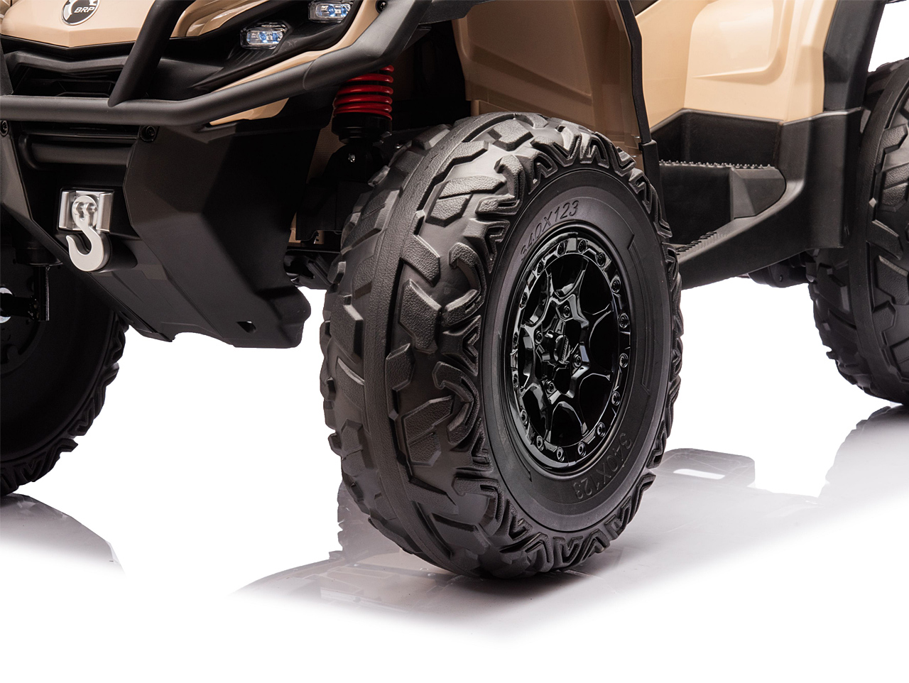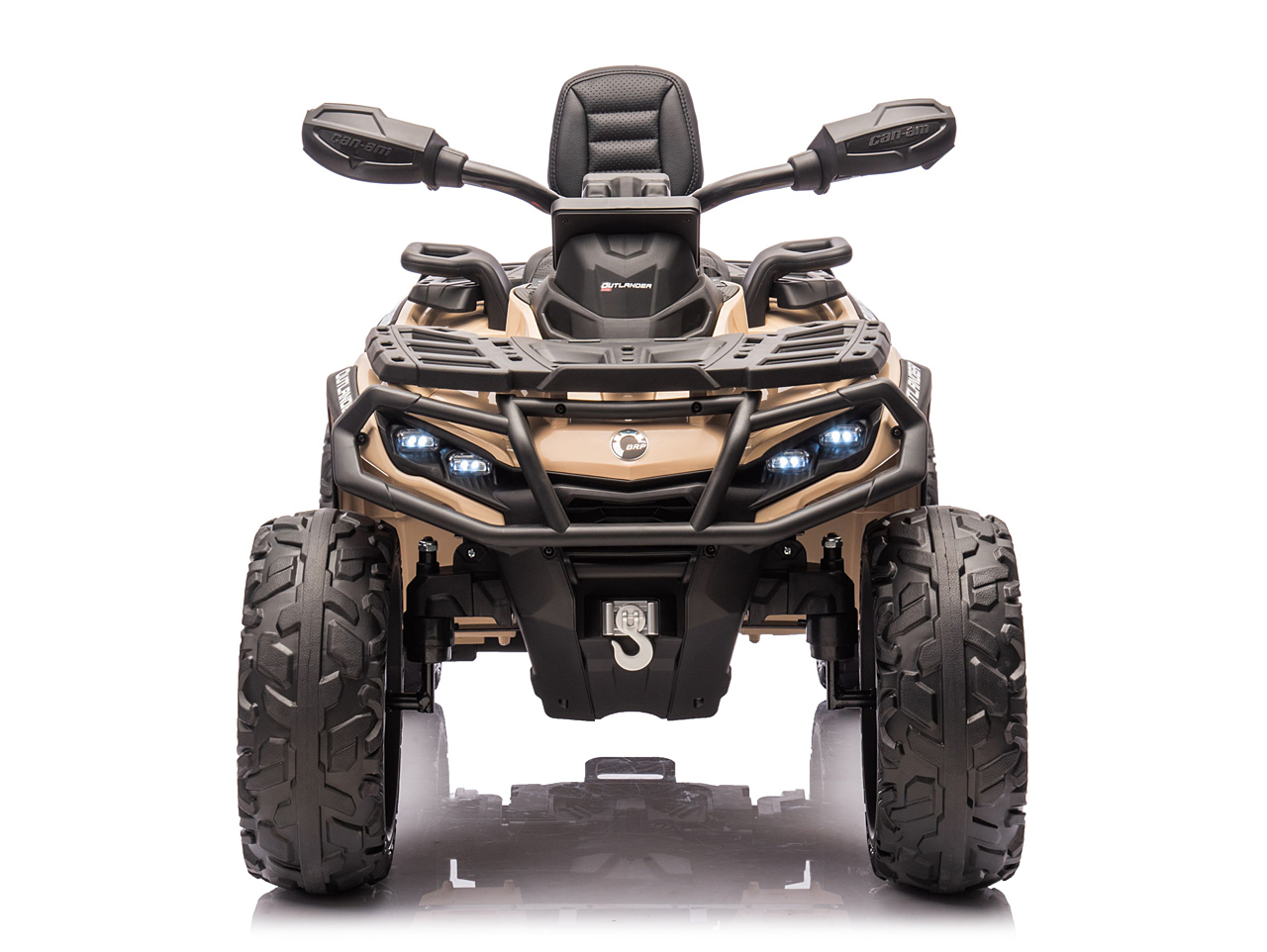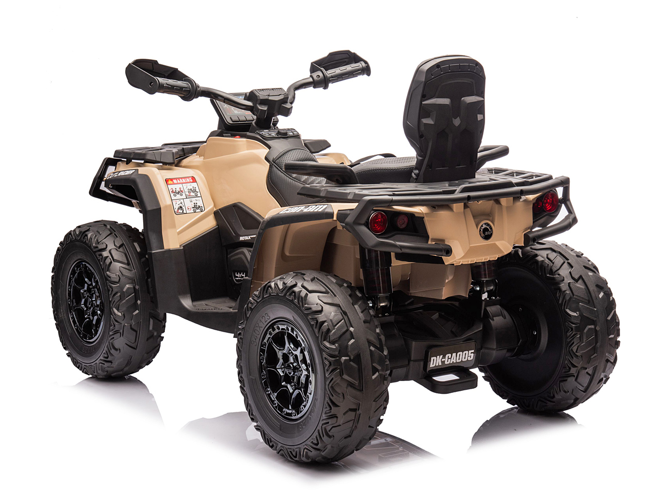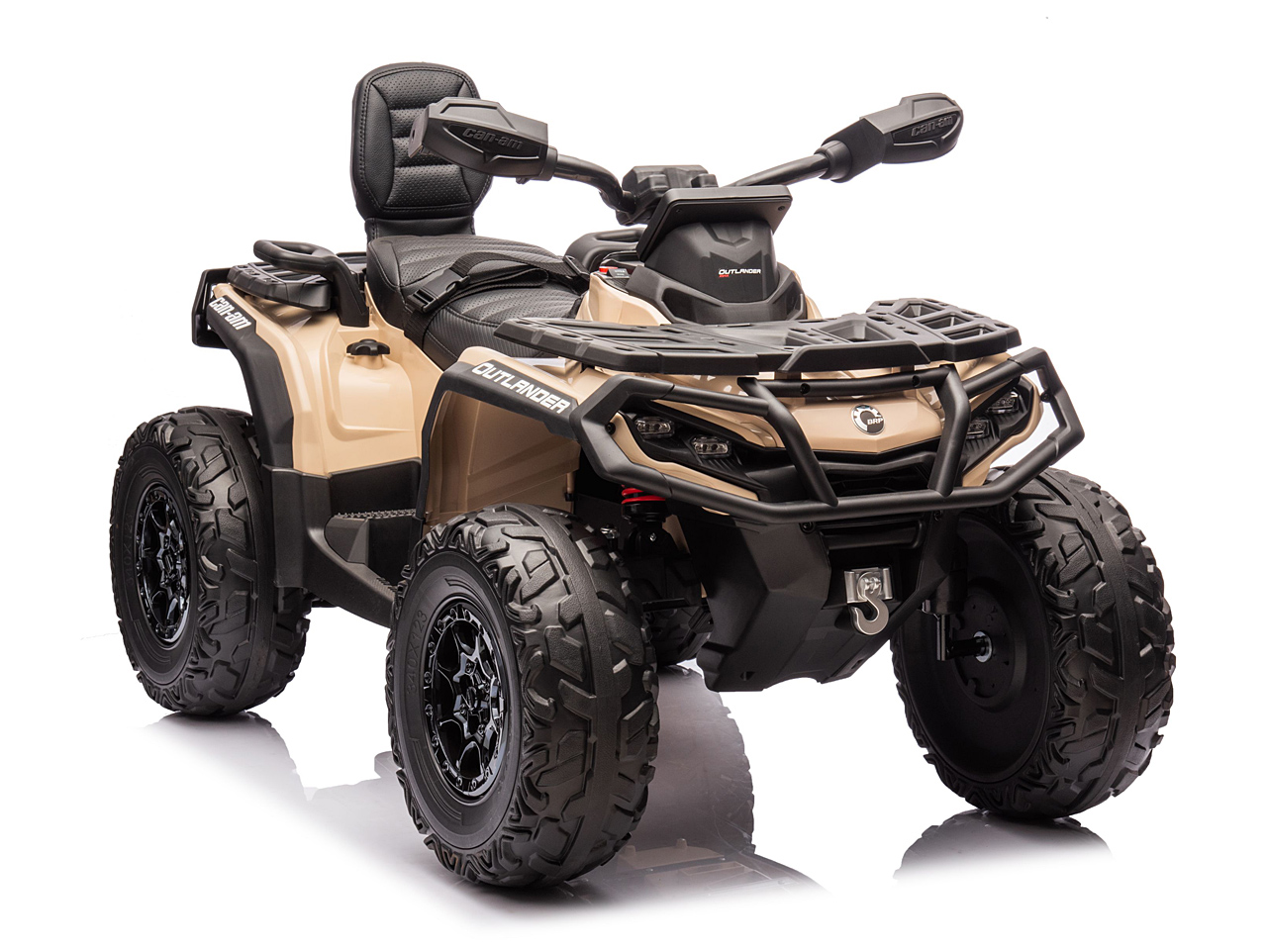 4 motory 24V/200W, prenosný box s batériou 24V/7Ah, pohon všetkých kolies, nosnosť 50 kg, vhodná aj pre jazdu dvoch detí, 2 rýchlosti, plynulý rozjazd, EVA kolesá na ložiskách, polstrovaná sedačka z eko kože, Bluetooth, USB, AUX, FM rádio, predné a zadné LED svetlá, odpruženie zadnej nápravy, ukazovateľ batérie (voltmeter), zvukové efekty, klaksón, licencia Can-Am Celý popis