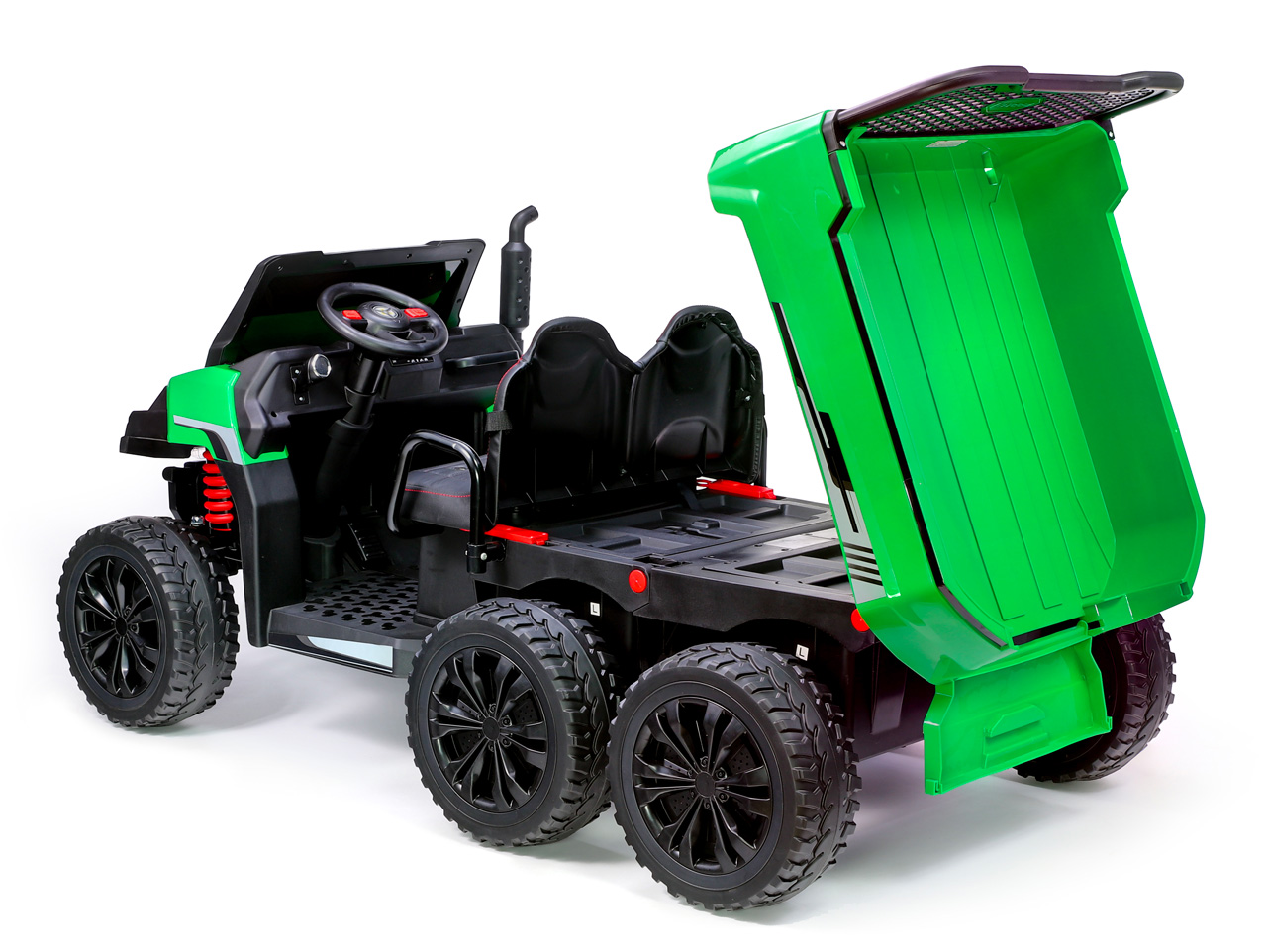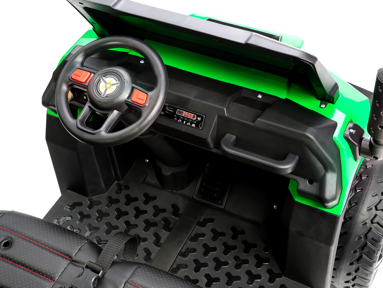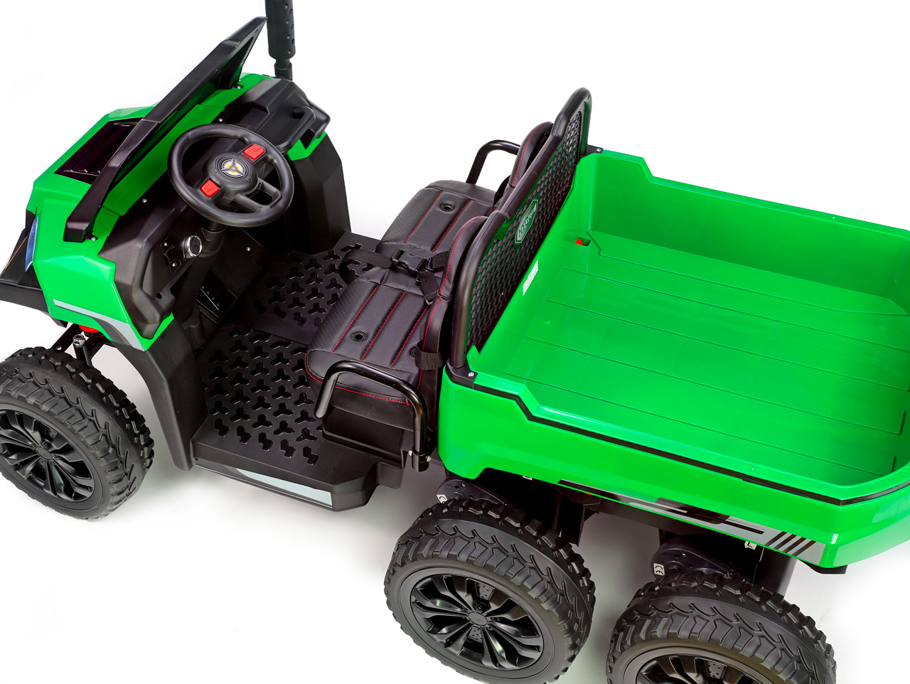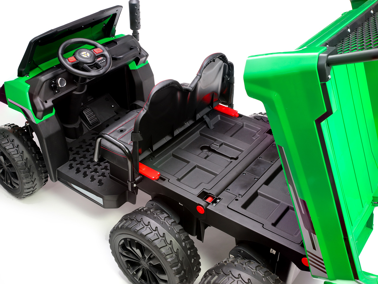 4x motor 24V/200W, batéria 24V/14Ah, 2.4G diaľkové ovládanie s funkciou plnej kontroly, 2 rýchlosti na manuál / 3 na diaľkové ovládanie, plynulý rozjazd, nosnosť 60 kg, Bluetooth, USB, AUX, SD slot, klaksón, LED svetlá, EVA kolesá, čalúnené sedadlo, odpruženie zadných náprav, výklopná nákladná korba, ukazovateľ stavu batérie, dvojmiestne Celý popis