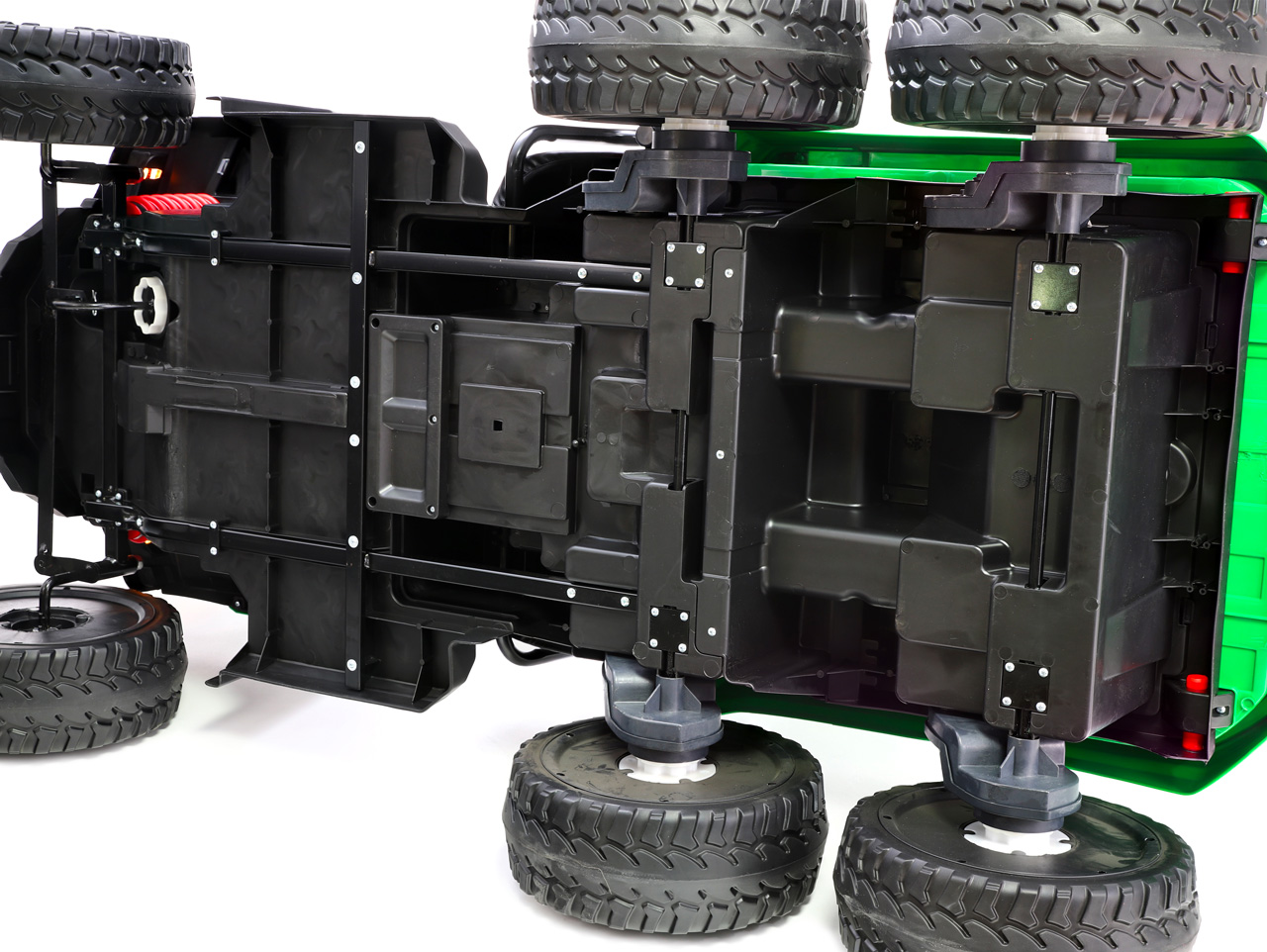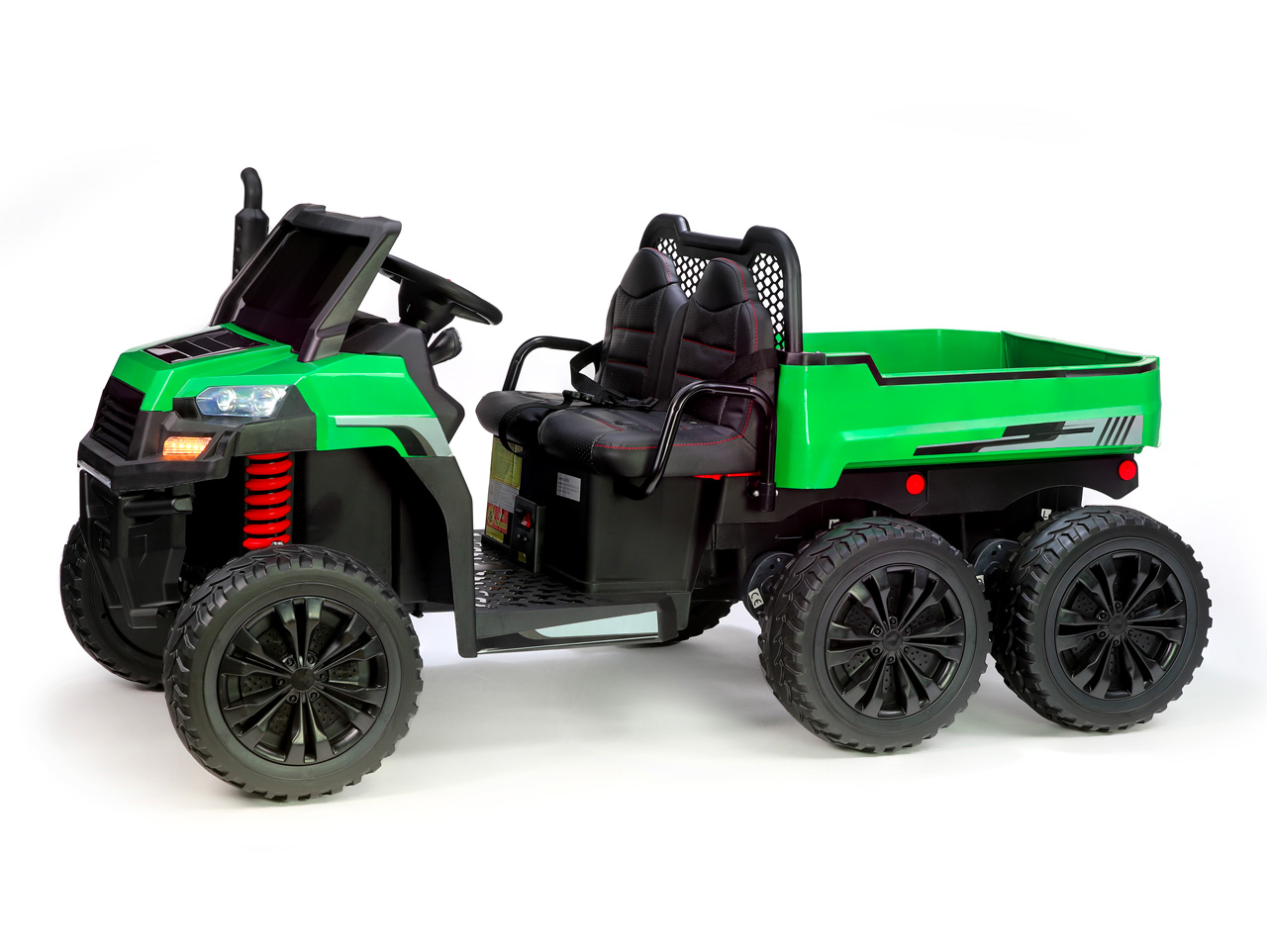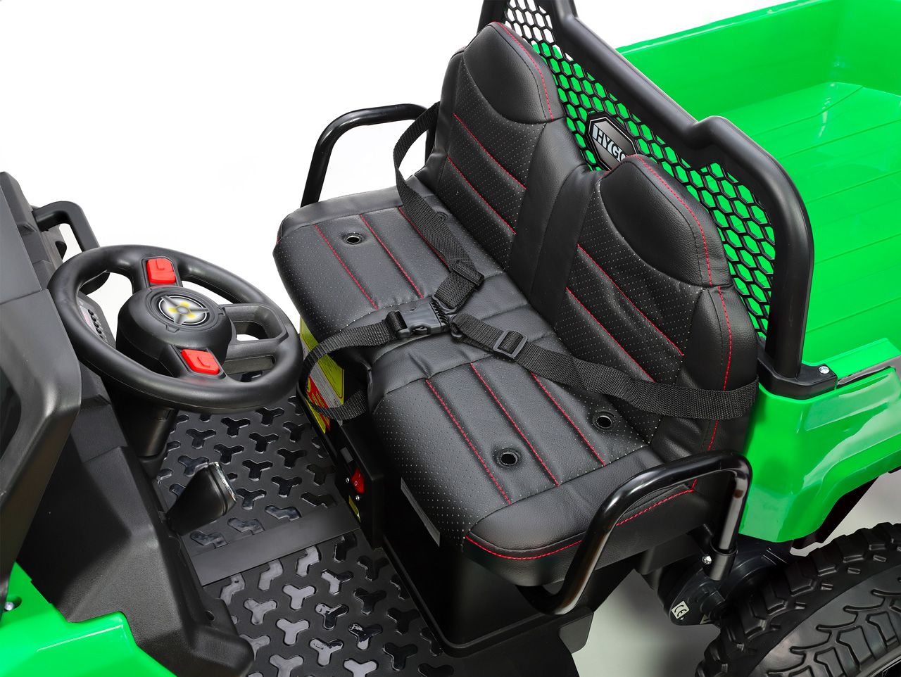 4x motor 24V/200W, batéria 24V/14Ah, 2.4G diaľkové ovládanie s funkciou plnej kontroly, 2 rýchlosti na manuál / 3 na diaľkové ovládanie, plynulý rozjazd, nosnosť 60 kg, Bluetooth, USB, AUX, SD slot, klaksón, LED svetlá, EVA kolesá, čalúnené sedadlo, odpruženie zadných náprav, výklopná nákladná korba, ukazovateľ stavu batérie, dvojmiestne Celý popis