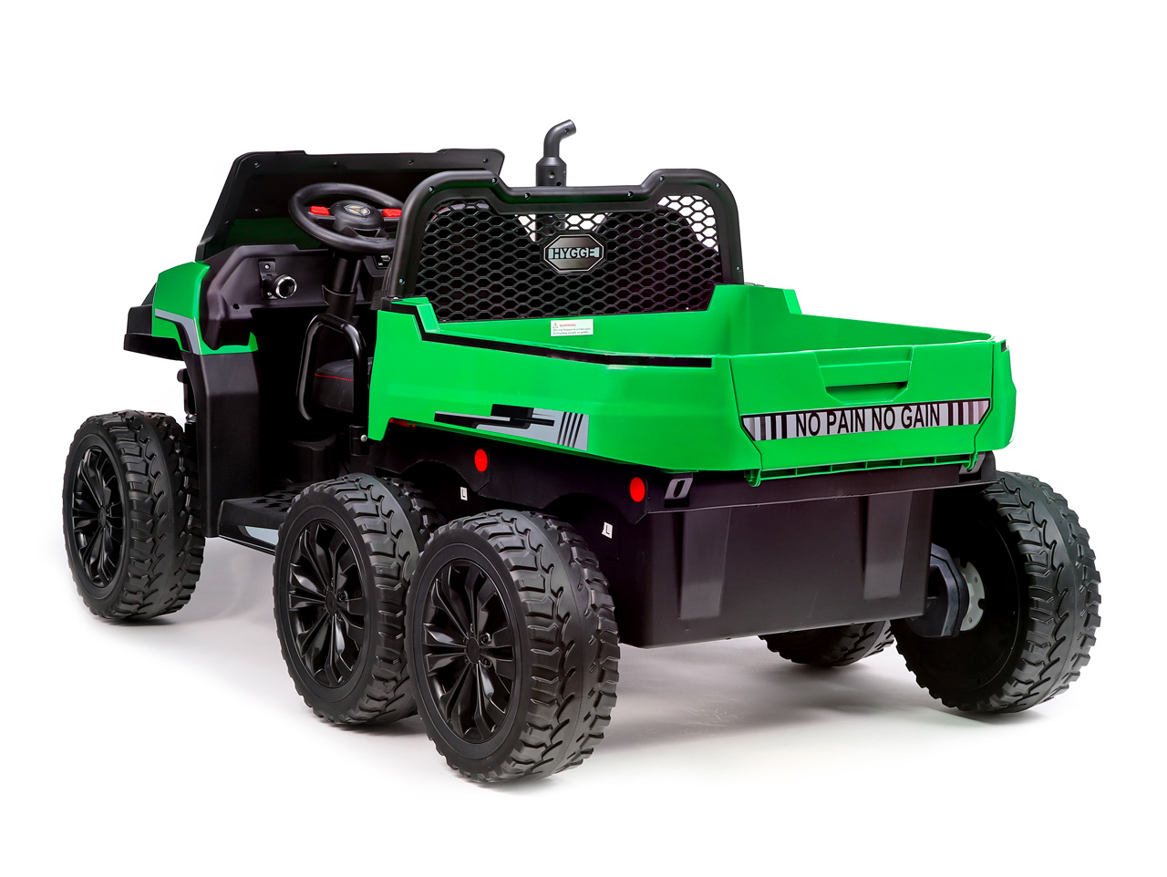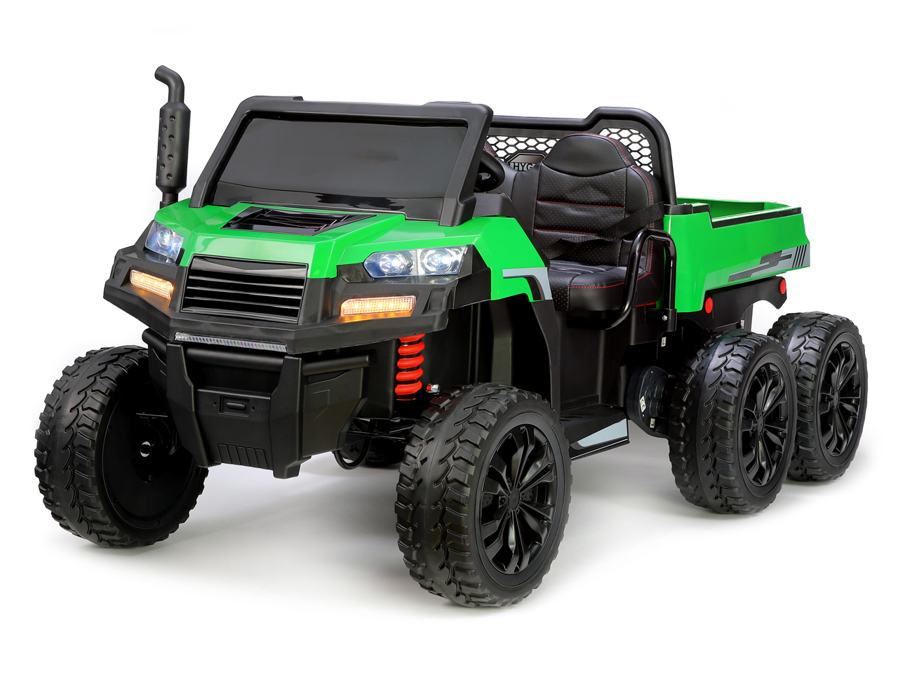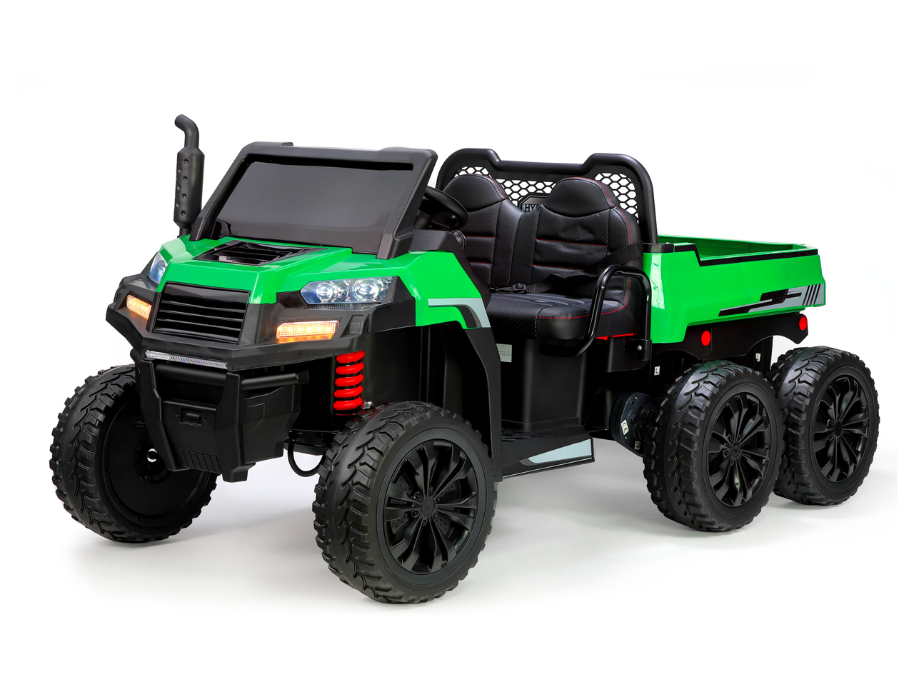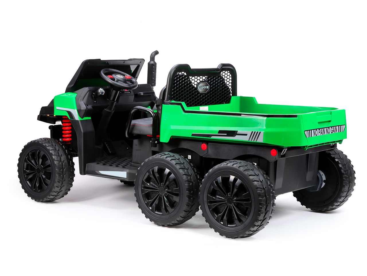 4x motor 24V/200W, batéria 24V/14Ah, 2.4G diaľkové ovládanie s funkciou plnej kontroly, 2 rýchlosti na manuál / 3 na diaľkové ovládanie, plynulý rozjazd, nosnosť 60 kg, Bluetooth, USB, AUX, SD slot, klaksón, LED svetlá, EVA kolesá, čalúnené sedadlo, odpruženie zadných náprav, výklopná nákladná korba, ukazovateľ stavu batérie, dvojmiestne Celý popis