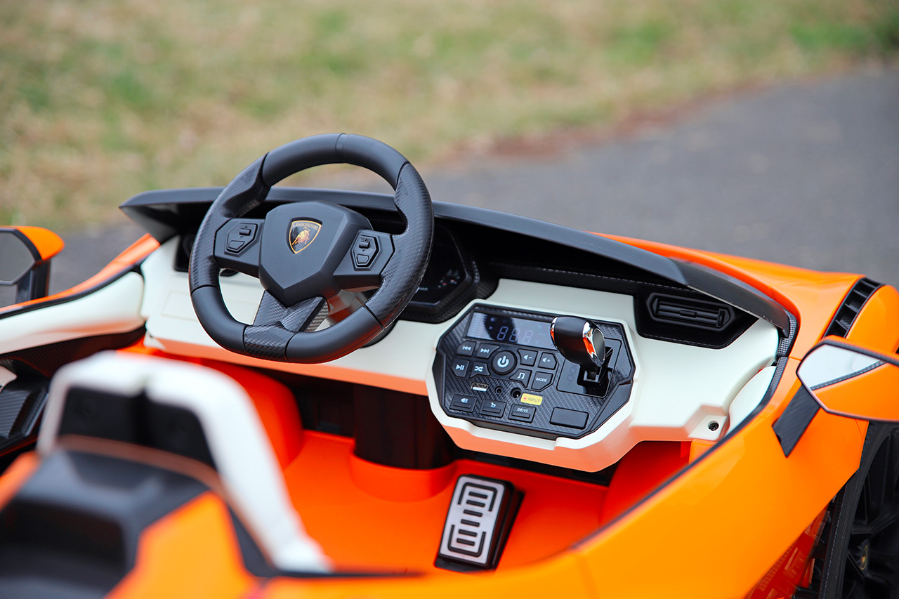 Perlou kabíny elektrického vozítka Lamborghini Sián je prístrojová doska s ovládacími prvkami a premakaným displejom. Voltmeter ukazuje stav batérie, takže nehrozí žiadne nečakané vybitie. Nájdete tu tlačidlo ovládajúce svetlá, hojdací aj jazdný režim. Displej zobrazuje zvolený režim alebo kontrolku zapnutých svetiel. Samozrejmosťou sú tlačidlá na prepínanie pesničiek vo formáte MP3 – k autíčku pripojíte mobil pomocou AUX (kábel s 3,5mm jackom) alebo Bluetooth, prípadne pustíte skladby z flash disku.