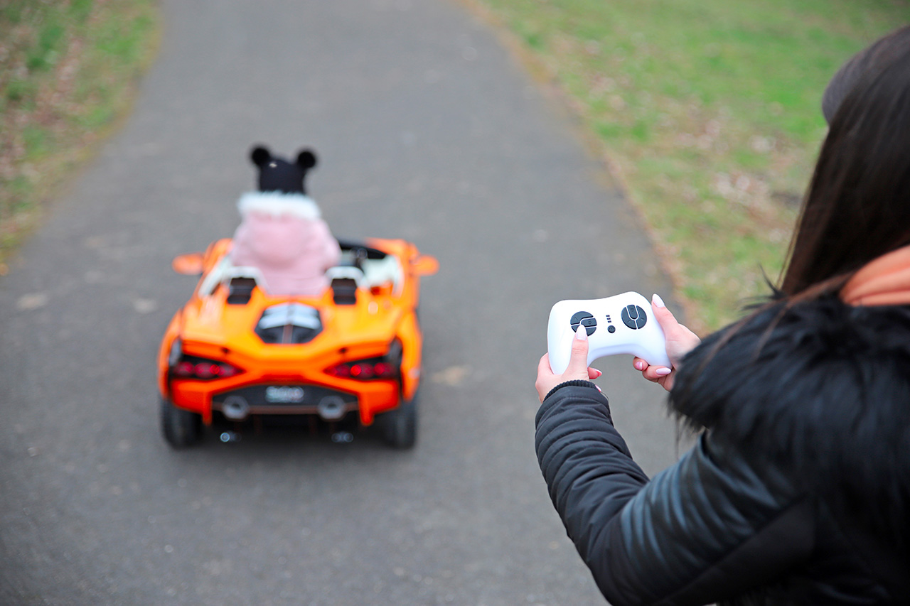 Lamborghini Sián dodávame s diaľkovým ovládaním, ktoré sa vďaka technológii 2.4G páruje priamo s daným vozidlom. Vozítko tak môžete plnohodnotne ovládať na diaľku, na ovládači nájdete aj tlačidlo pre núdzové zastavenie. Keďže diaľkové ovládanie má prednosť pred manuálnym riadením, budete mať ako rodič vždy posledné slovo, keby riadenie Lamborghini malému vodičovi stúplo do hlavy.