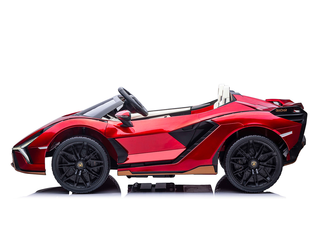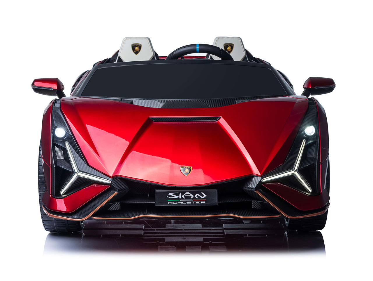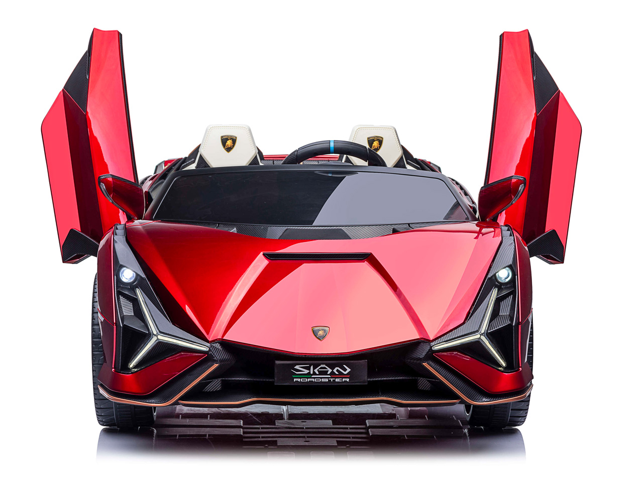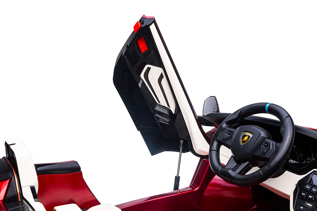 Skutočný model Lamborghini Sián stavia na majstrovstvách talianskych dizajnérov, naše elektrické autíčko svoj veľký vzor kopíruje. Efektné biele polstrované sedačky z eko kože zdobia logo Lamborghini, rovnako ako ergonomický volant. Rodičia malých vodičov môžu byť pokojní, pretože sedačka je vybavená bezpečnostným pásom a autíčko splnilo všetky relevantné bezpečnostné testy EÚ.