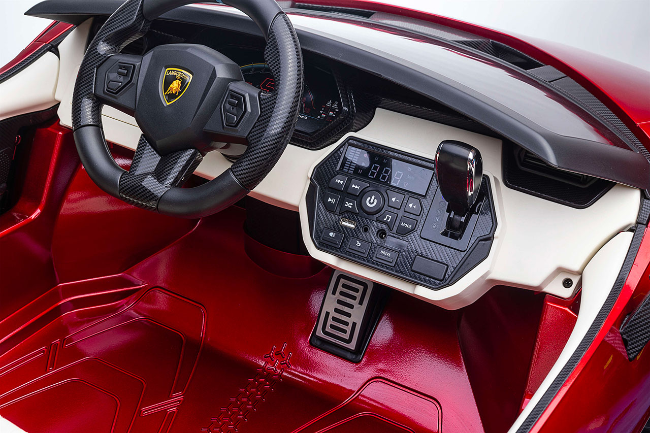 Perlou kabíny elektrického vozítka Lamborghini Sián je prístrojová doska s ovládacími prvkami a premakaným displejom. Voltmeter ukazuje stav batérie, takže nehrozí žiadne nečakané vybitie. Nájdete tu tlačidlo ovládajúce svetlá, hojdací aj jazdný režim. Displej zobrazuje zvolený režim alebo kontrolku zapnutých svetiel. Samozrejmosťou sú tlačidlá na prepínanie pesničiek vo formáte MP3 – k autíčku pripojíte mobil pomocou AUX (kábel s 3,5mm jackom) alebo Bluetooth, prípadne pustíte skladby z flash disku.