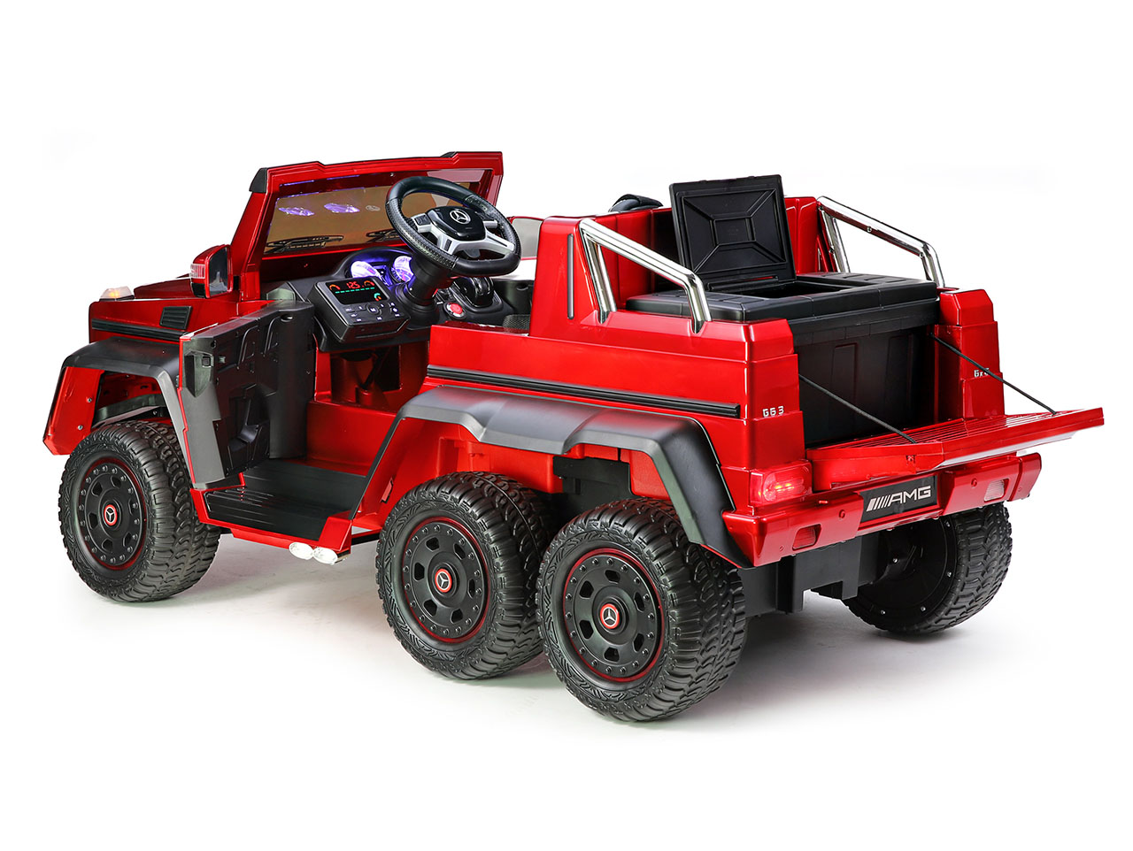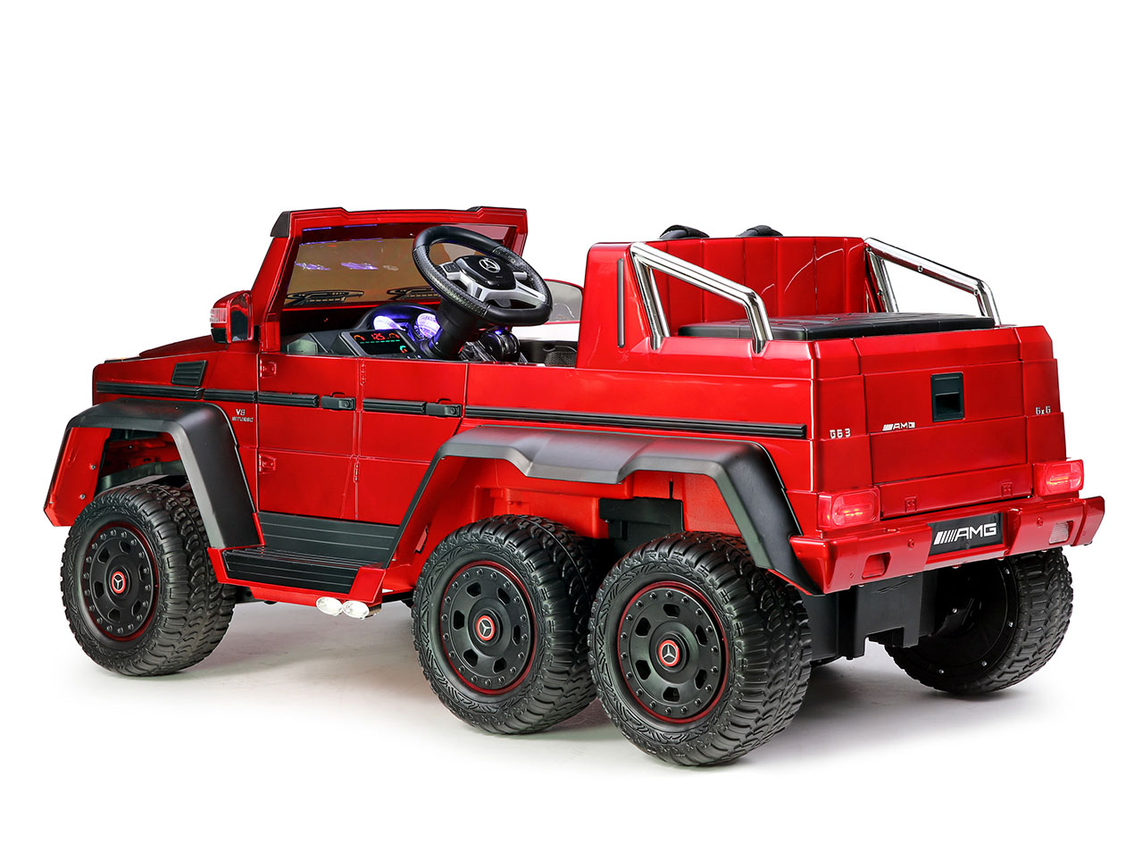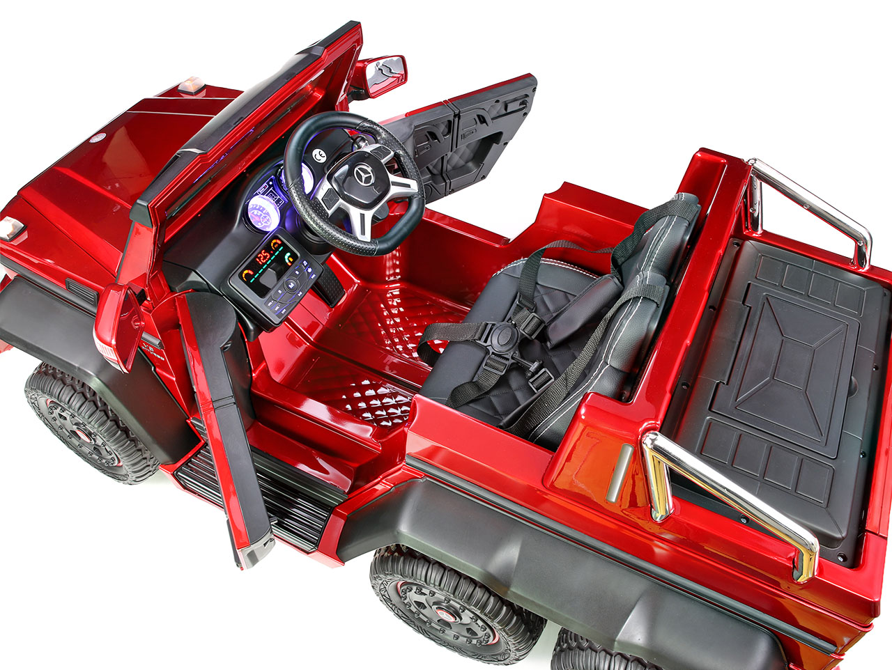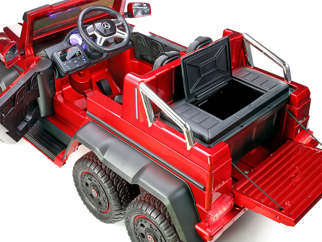 6 motorov 12V/45W, box s batériou 12V/14Ah + 12V/10Ah zadarmo, 2 rýchlosti na manuál / 3 na diaľkové ovládanie (2.4G), rýchloupínacie EVA kolesá, polstrovaná sedačka, Bluetooth, USB, SD, AUX, FM rádio, zadné dve nápravy odpružené, nosnosť 110 kg, plynulý rozjazd, LED svetlá, zvukové efekty, otvárateľné dvere, ukazovateľ stavu batérií, lakovanie, zadný úložný priestor, licencia Mercedes-Benz Celý popis