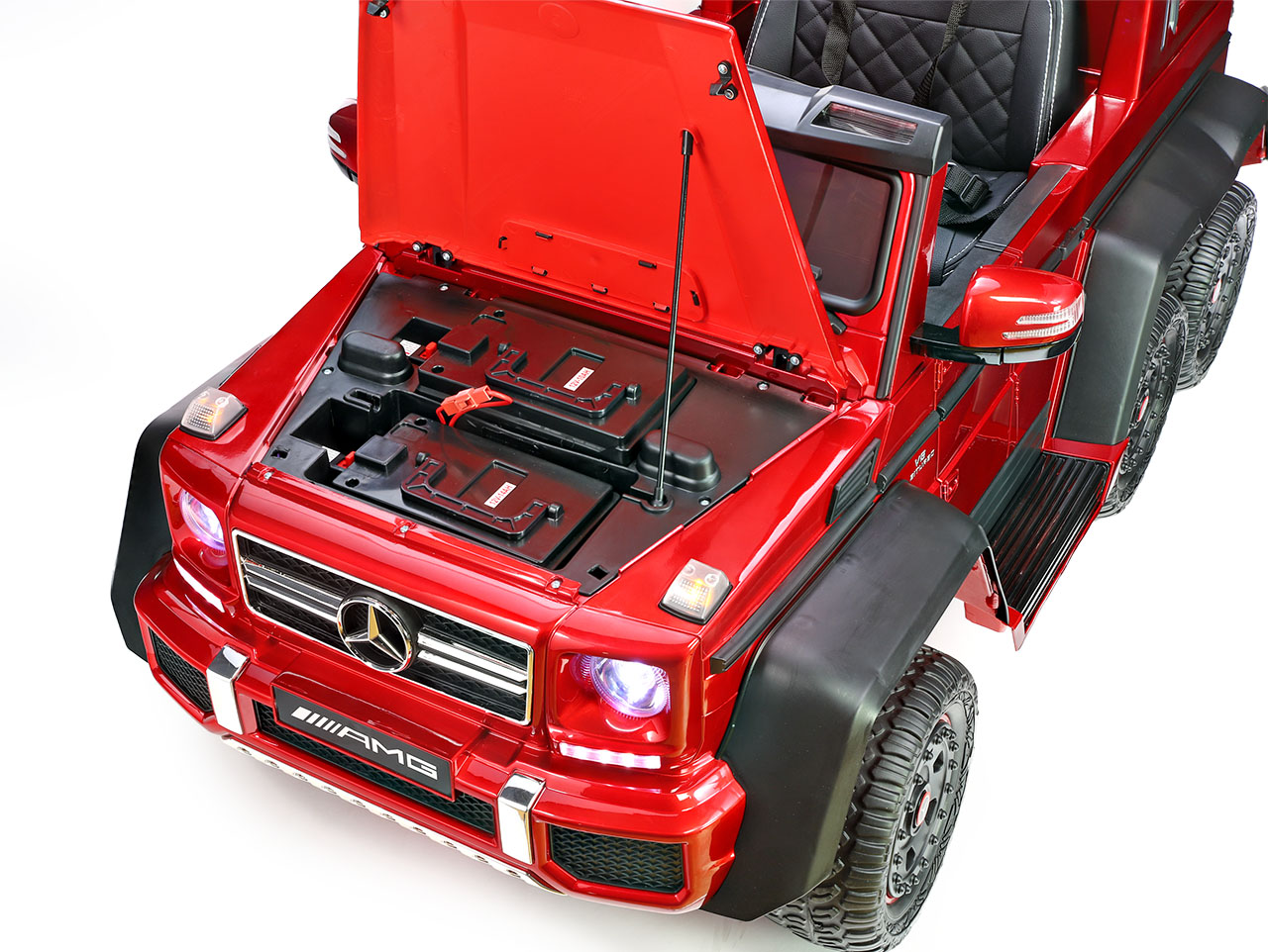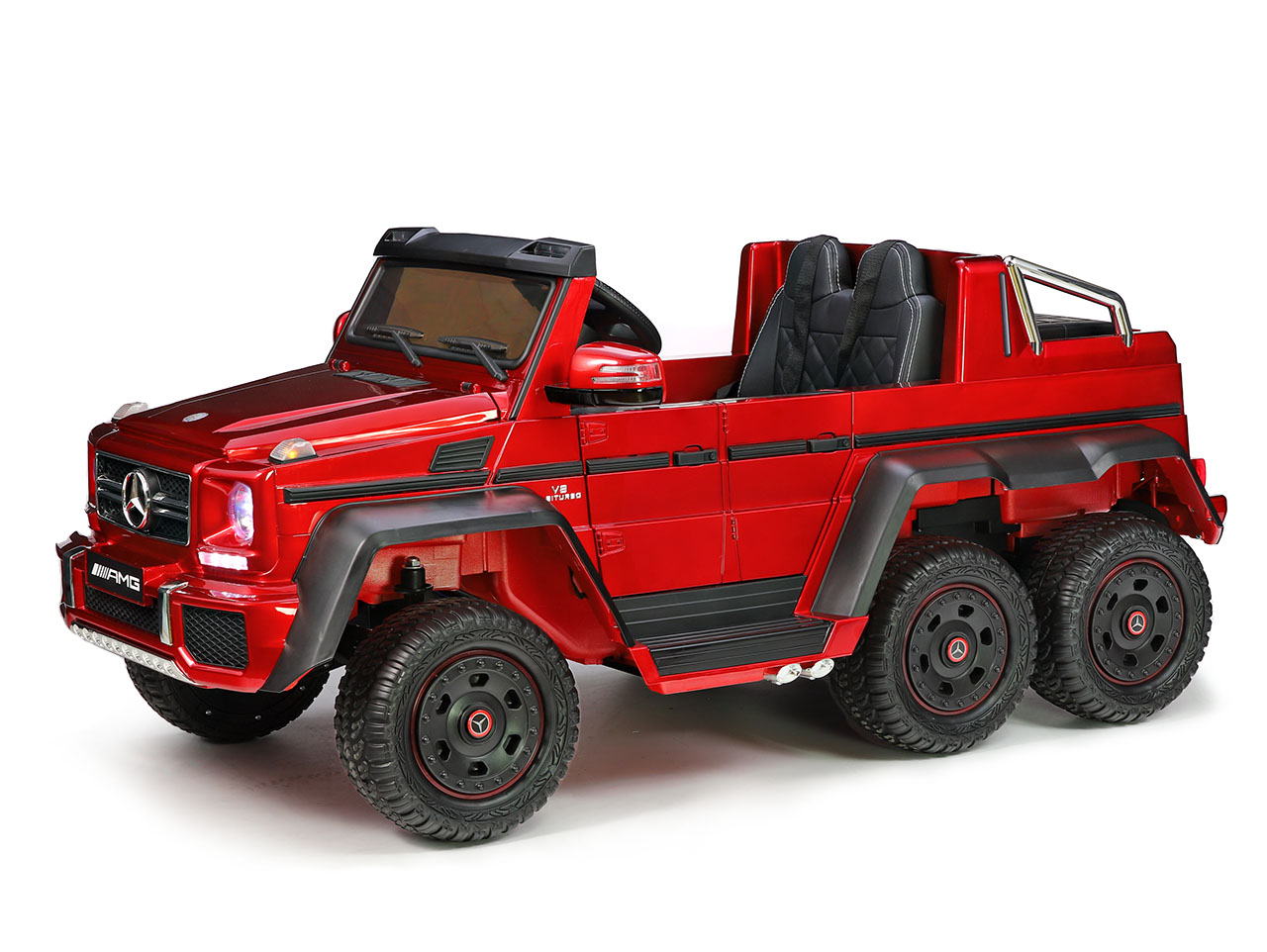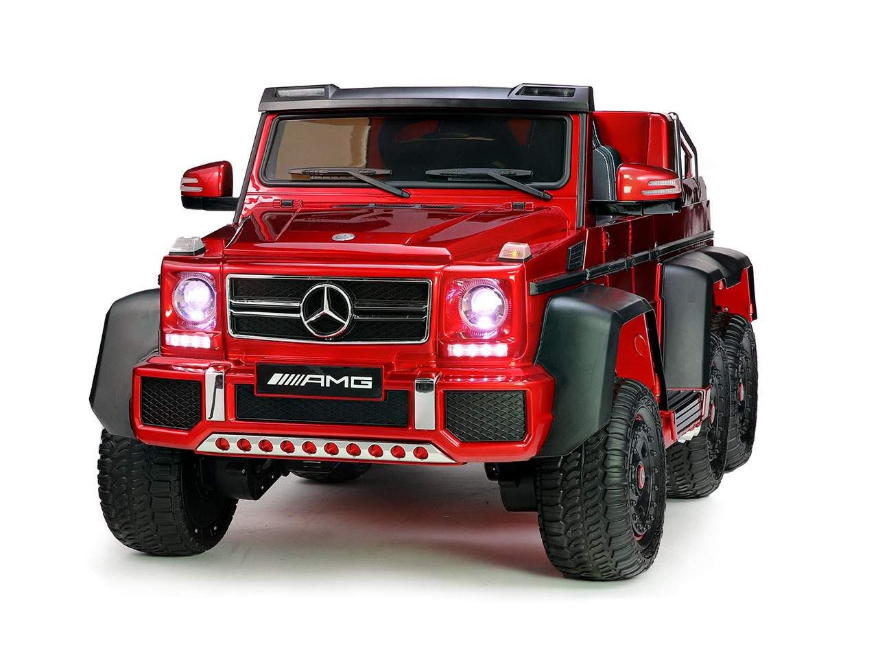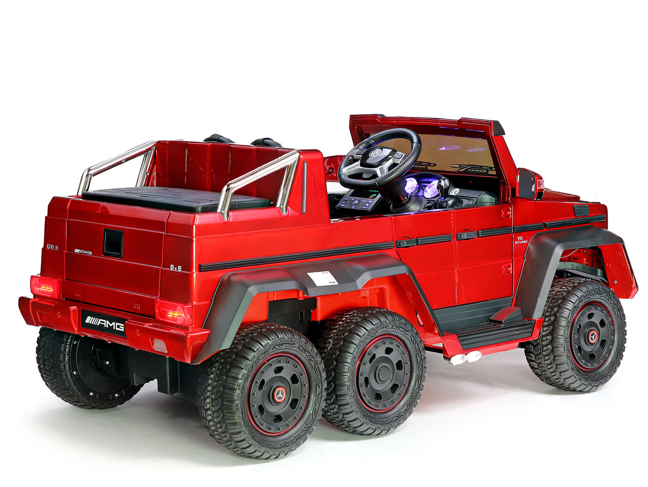 6 motorov 12V/45W, box s batériou 12V/14Ah + 12V/10Ah zadarmo, 2 rýchlosti na manuál / 3 na diaľkové ovládanie (2.4G), rýchloupínacie EVA kolesá, polstrovaná sedačka, Bluetooth, USB, SD, AUX, FM rádio, zadné dve nápravy odpružené, nosnosť 110 kg, plynulý rozjazd, LED svetlá, zvukové efekty, otvárateľné dvere, ukazovateľ stavu batérií, lakovanie, zadný úložný priestor, licencia Mercedes-Benz Celý popis