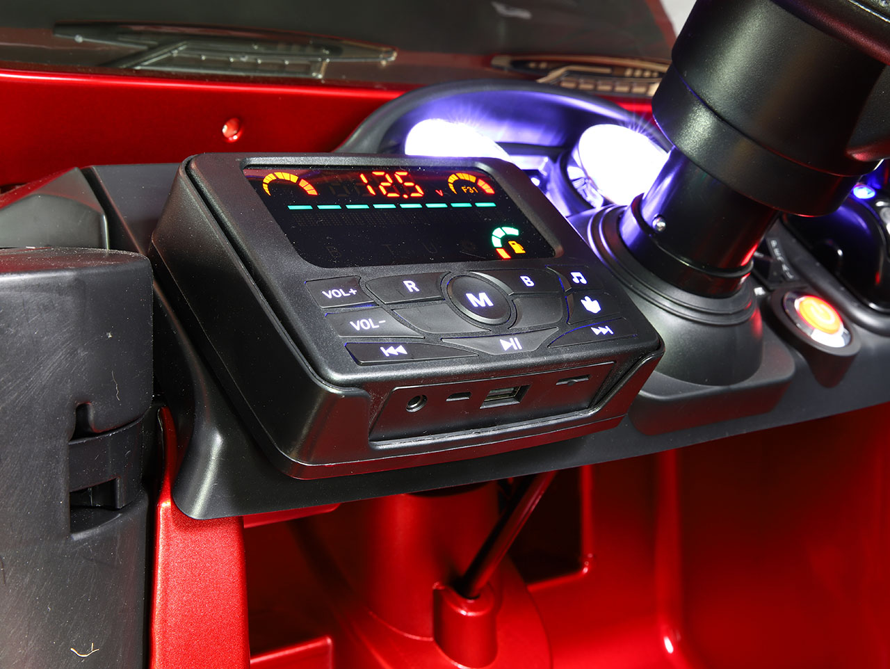 Hudobný panel plní ešte jednu dôležitú funkciu. Na displeji totiž zobrazuje stav batérie autíčka. , batéria potrebuje dobiť. Uznávame, že voltmeter sa na prvý pohľad môže zdať trochu neintuitívny. uvidíte, že funguje spoľahlivo.