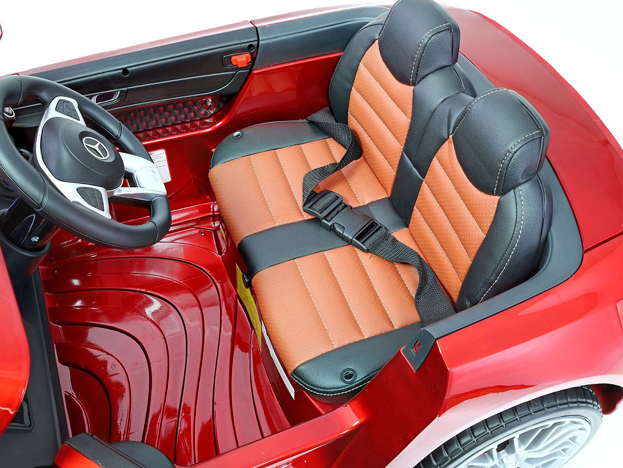 2 motory 12V/35W, batéria 12V/7Ah, 1 rýchlosť na manuál / 3 na diaľkové ovládanie (2.4G), plynulý rozjazd, polstrovaná sedačka z eko kože, EVA kolesá, odpruženie oboch náprav, lakované, USB, SD, AUX, LED svetlá, klaksón, štartovacie klíčky, otvárateľné dvere, výsuvné kolieska pre ručné ťahanie, ukazovateľ stavu batérie, licencia Mercedes-Benz Celý popis