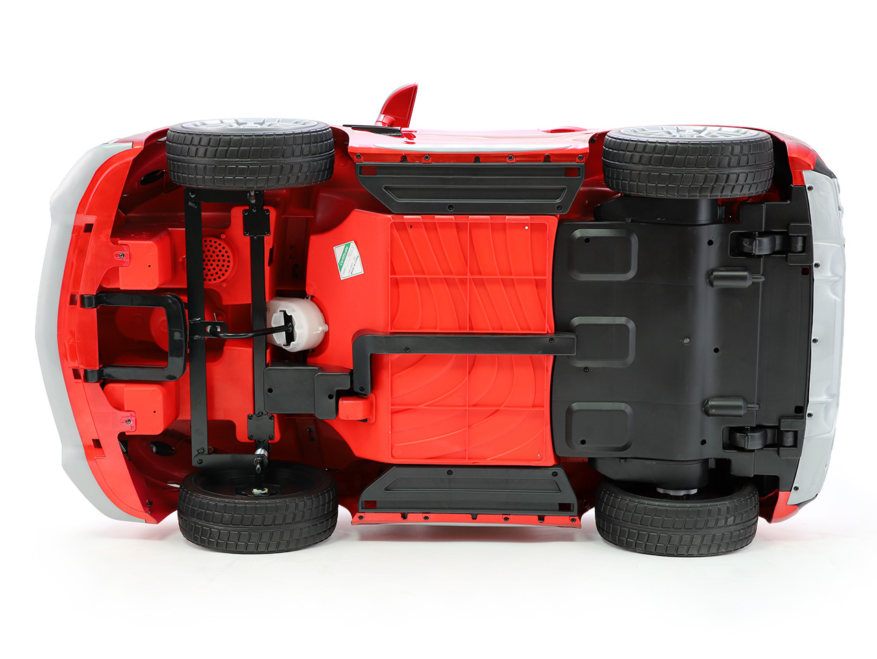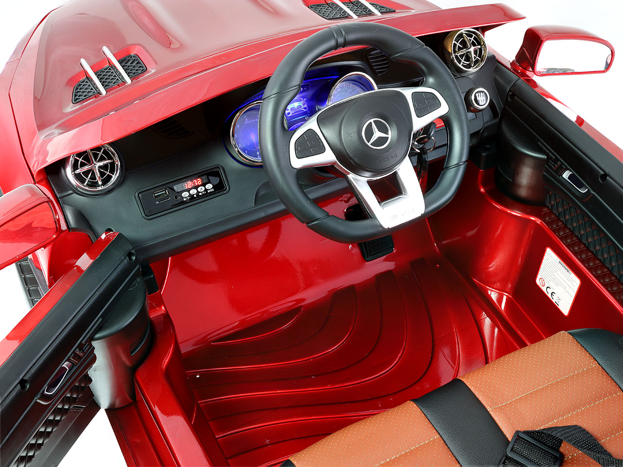 Lesk a sýte farby vládnu aj v interiéri elektrického autíčka, pričom v otázke pohodlia si s pravým meďourom toto vozítko nezadá. Polstrovaná sedačka z EKO kože, odpružené obe nápravy a mäkké kolesá z EVA materiálu zaručia plynulú jazdu bez zbytočného natriasania . Prístrojová doska potom poskytuje prehľad o stave batérie a na dosah detských prstov prináša ovládacie prvky. Vlastnú hudbu si môžu deti púšťať pomocou AUX alebo USB pripojenia, prípadne je možné vložiť vlastnú SD kartu. Pesničky sa prepínajú tlačidlami, klaksón sa ovláda ako inak ako tlačidlom na volante .