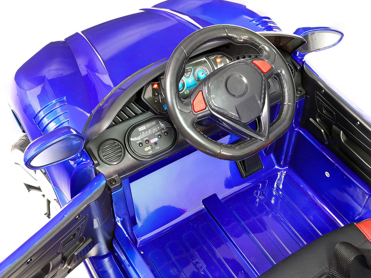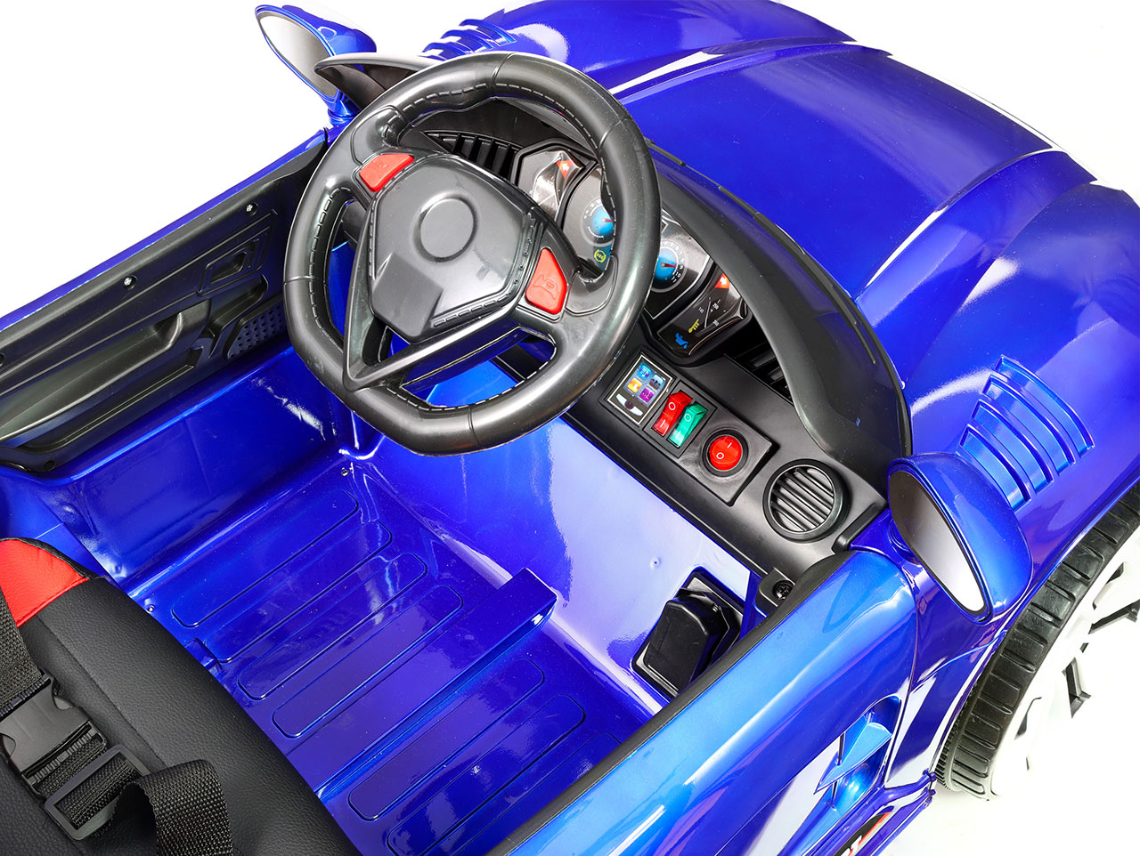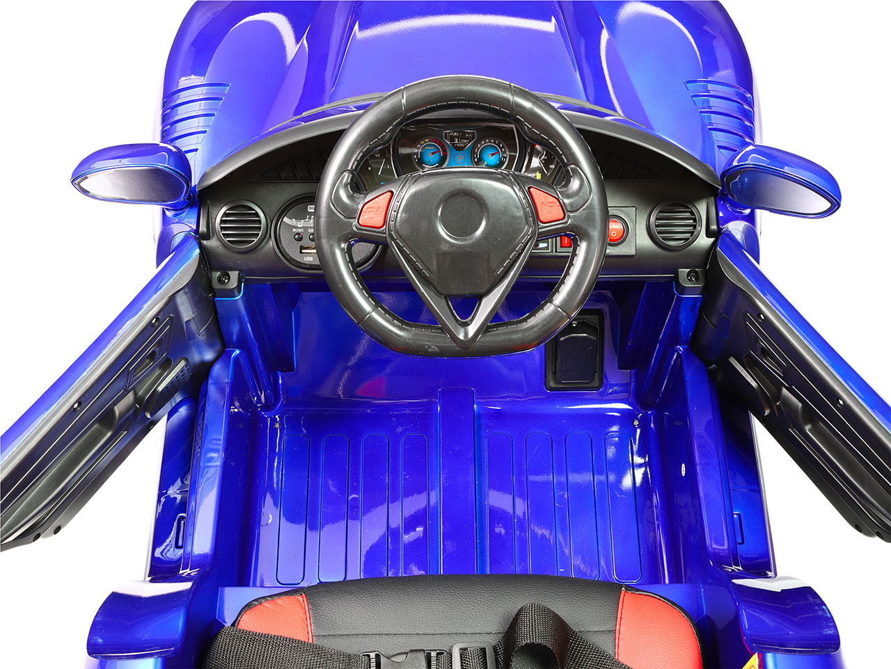 4x motor 12V/28W, 1x batéria 12V/7Ah, 2.4G diaľkové ovládanie, 1 rýchlosť na manuál / 3 na diaľkové ovládanie, plastové kolesá, čalúnená sedačka, USB, AUX, zvukové efekty, klaksón, LED osvetlenie, otvárateľné dvere, ukazovateľ stavu batérie, lakovanie, výsuvná vodiaca tyč, funkcia hojdania Celý popis