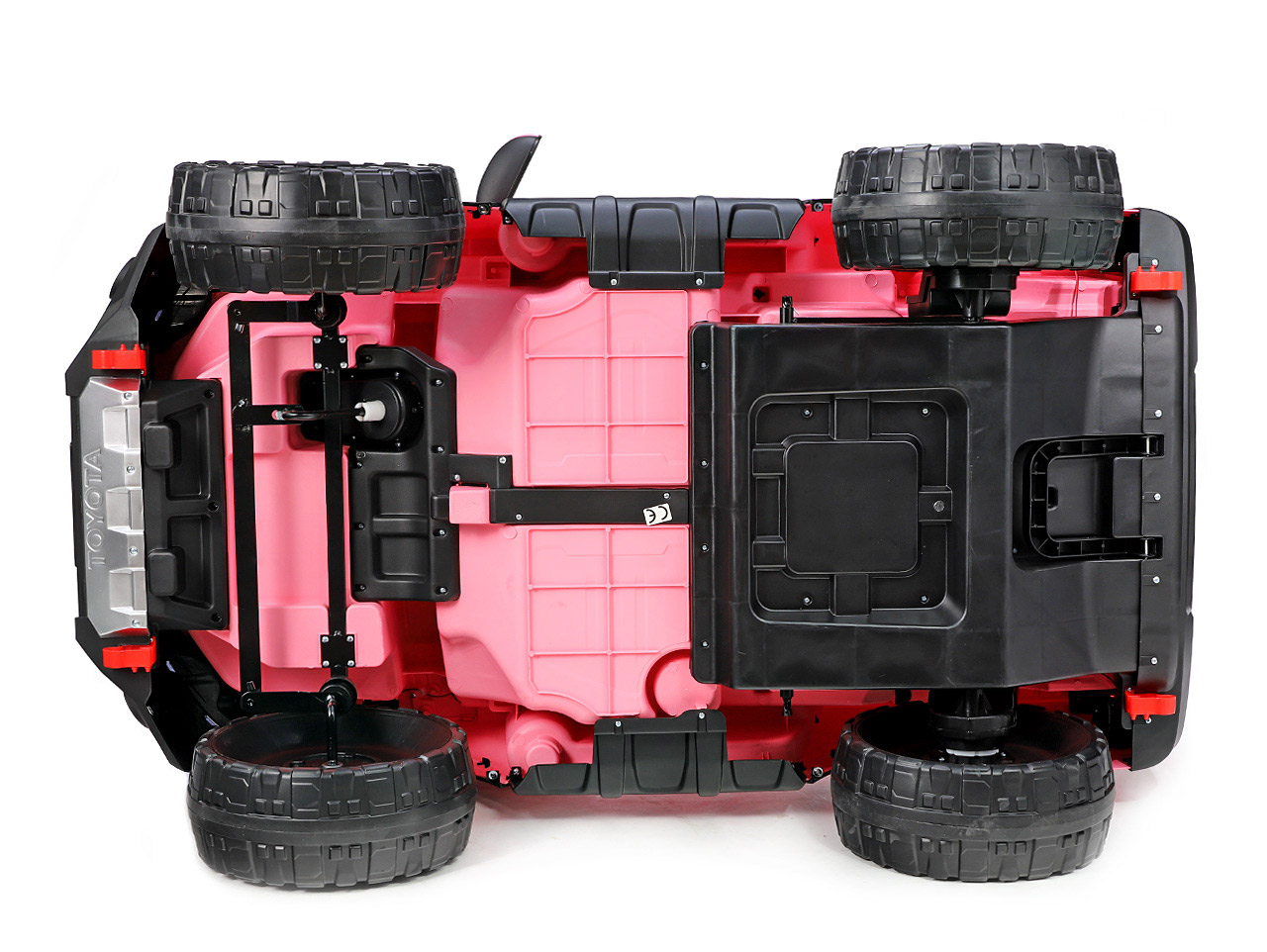 4x motor 24V/200W, 2x batérie 24V/7Ah spojené do 24V/14Ah, 2 rýchlosti na manuál / 3 na diaľkové ovládanie, plynulý rozjazd, Bluetooth, USB, SD, AUX, LED svetlá, polstrované sedadlá z eko kože, EVA kolesá, odpruženie zadnej nápravy, štartovacie kľúčiky, lakovanie, nosnosť 50 kg, otvárateľné dvere + kapota a zadné čelo, ukazovateľ batérie, výklopné držadlo, dvojmiestne, licencia Toyota Celý popis