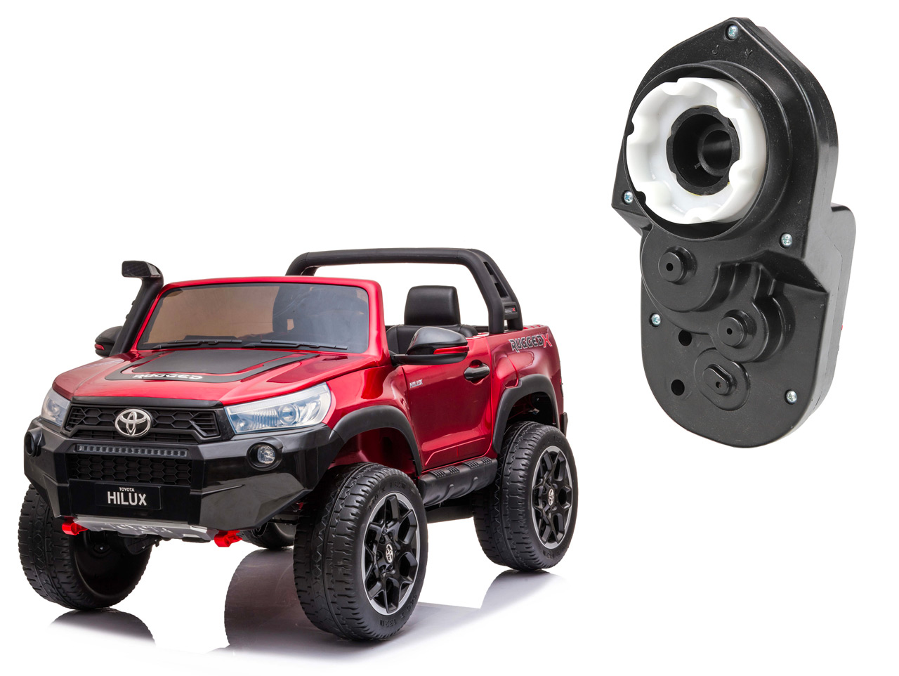 Určený pre elektrické autíčko Toyota Hilux 24V (model číslo DK-HL850-24V); dĺžka 202 mm, šírka 107 mm, priemer otvoru v prevodovke 18 mm, napätie 24 V. Pred objednaním náhradného dielu venujte pozornosť fotografiám a popisu. Odporúčame skontrolovať, či sa náhradný diel zhoduje s dielom vo vašom vozidle. Celý popis