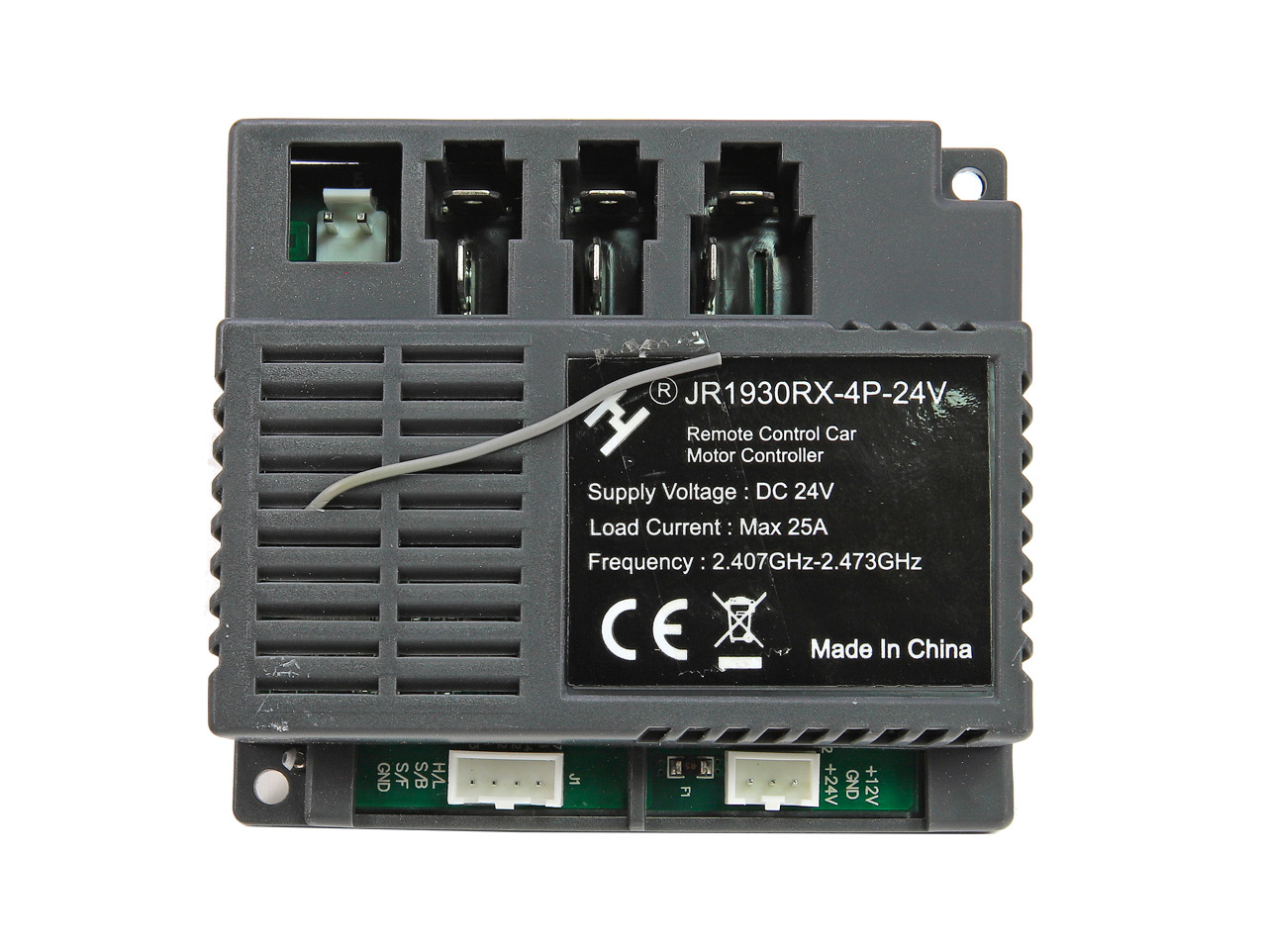 Riadiaca jednotka s typovým označením JR1930RX-4P-24V je určená pre detské elektrické vozidlá; napätie 24 V. Pred objednaním starostlivo skontrolujte typové označenie (kód na štítku), prípadne tiež konektory a koncovky káblov. Náhradná jednotka musí byť rovnaká ako pôvodná jednotka vo vašom vozidle, inak nebude fungovať. Celý popis