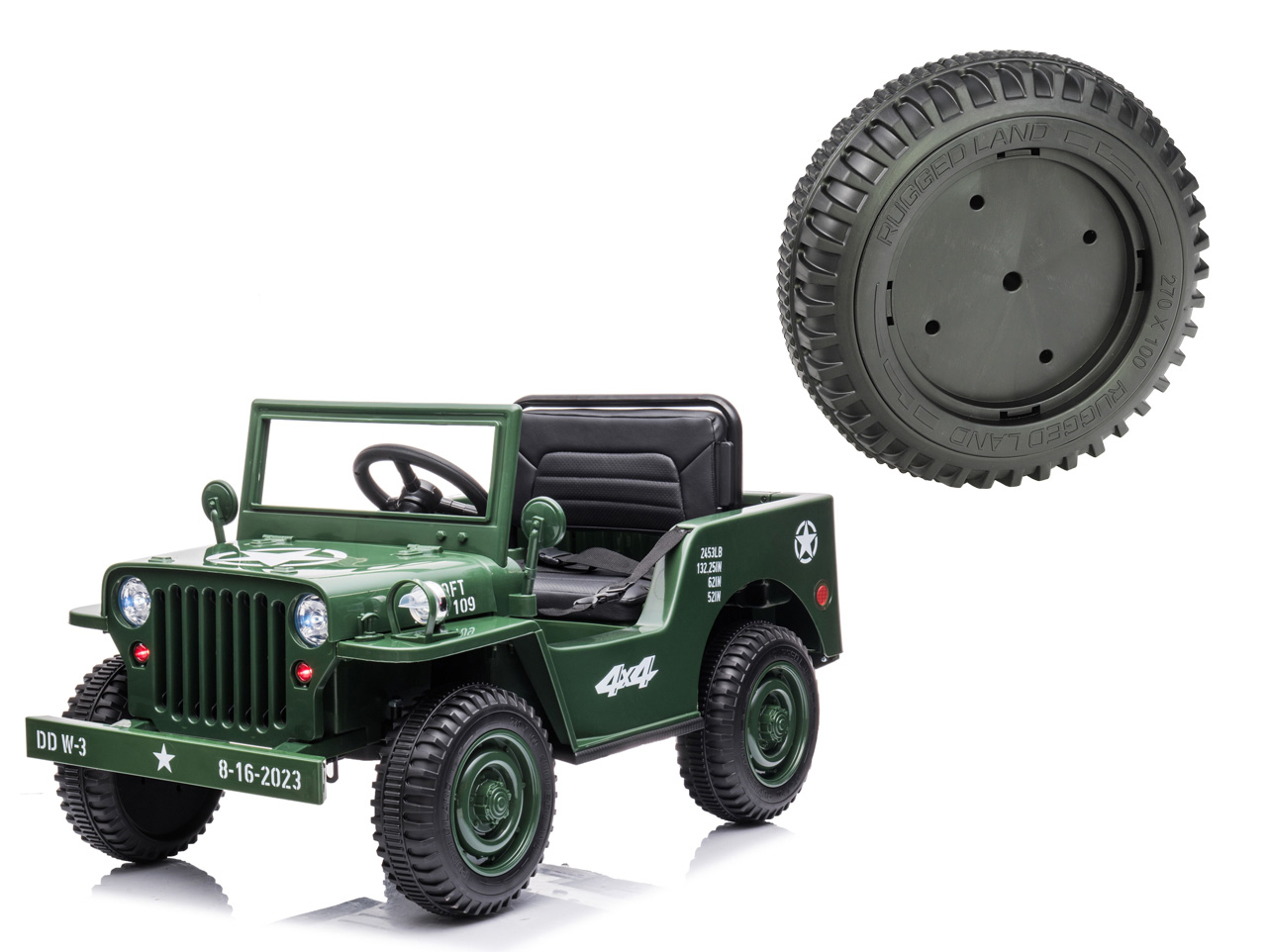 Určené pre detské elektrické autíčko Džíp Willys 4x4 jednomiestny (model č. JH-103). Bicykel je univerzálny, možno teda použiť na ktorúkoľvek stranu. Vyrobené z EVA materiálu. Priemer 270 mm, šírka 90 mm, je možné nasadiť na os s priemerom 12 mm. Celý popis