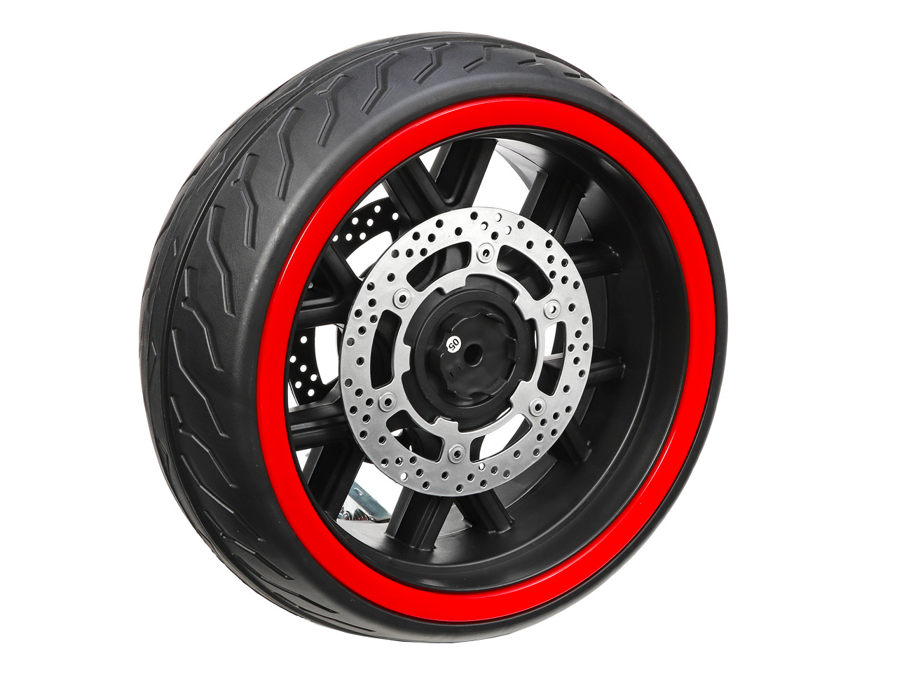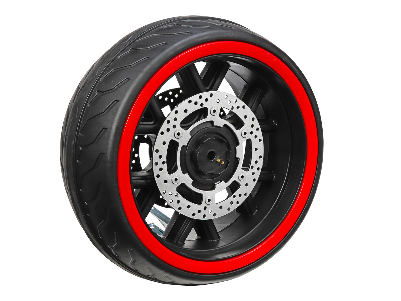 Náhradné plastové koleso s gumovým pásom je určené pre detskú elektrickú motorku CBR 650 (model číslo N999). Svietiaci ľad koleso je na zadnú časť motorky.
