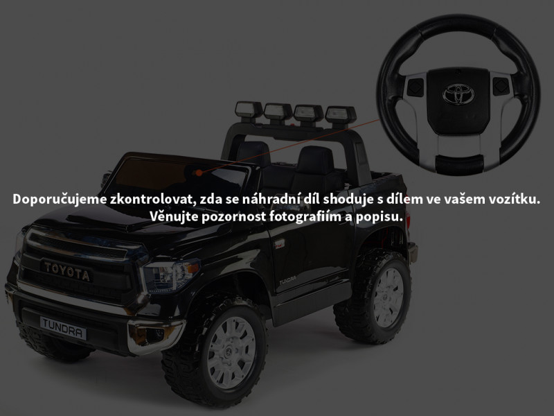 Volant určený pre detské elektrické autíčko Toyota Tundra 12V (menšia verzia), priemer volantu 20 cm, je možné nasadiť na os s priemerom 10 mm. Pred objednaním náhradného dielu venujte pozornosť fotografiám a popisu. Aj keď máte rovnaké vozidlo, jednotlivé diely sa môžu líšiť. Odporúčame preto pozorne skontrolovať, či sa náhradný diel zhoduje s dielom vo vašom vozidle. Celý popis