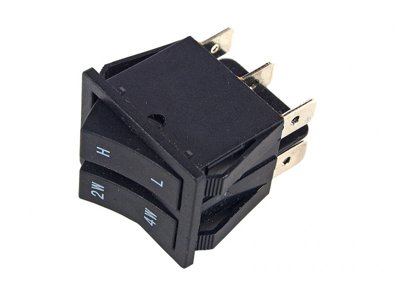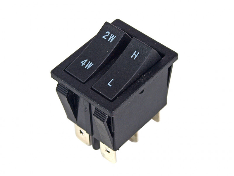 Náhradný prepínač dvojpólový určený pre detské vozítka - autíčka, motorky, štvorkolky, traktory, buginy. Prepínač plní funkciu prepínania pohonu 2x2/4x4 (teda pohon iba na zadné kolesá / pohon všetkých kolies) a prepínanie H/L (rýchle/pomalé jazdy).