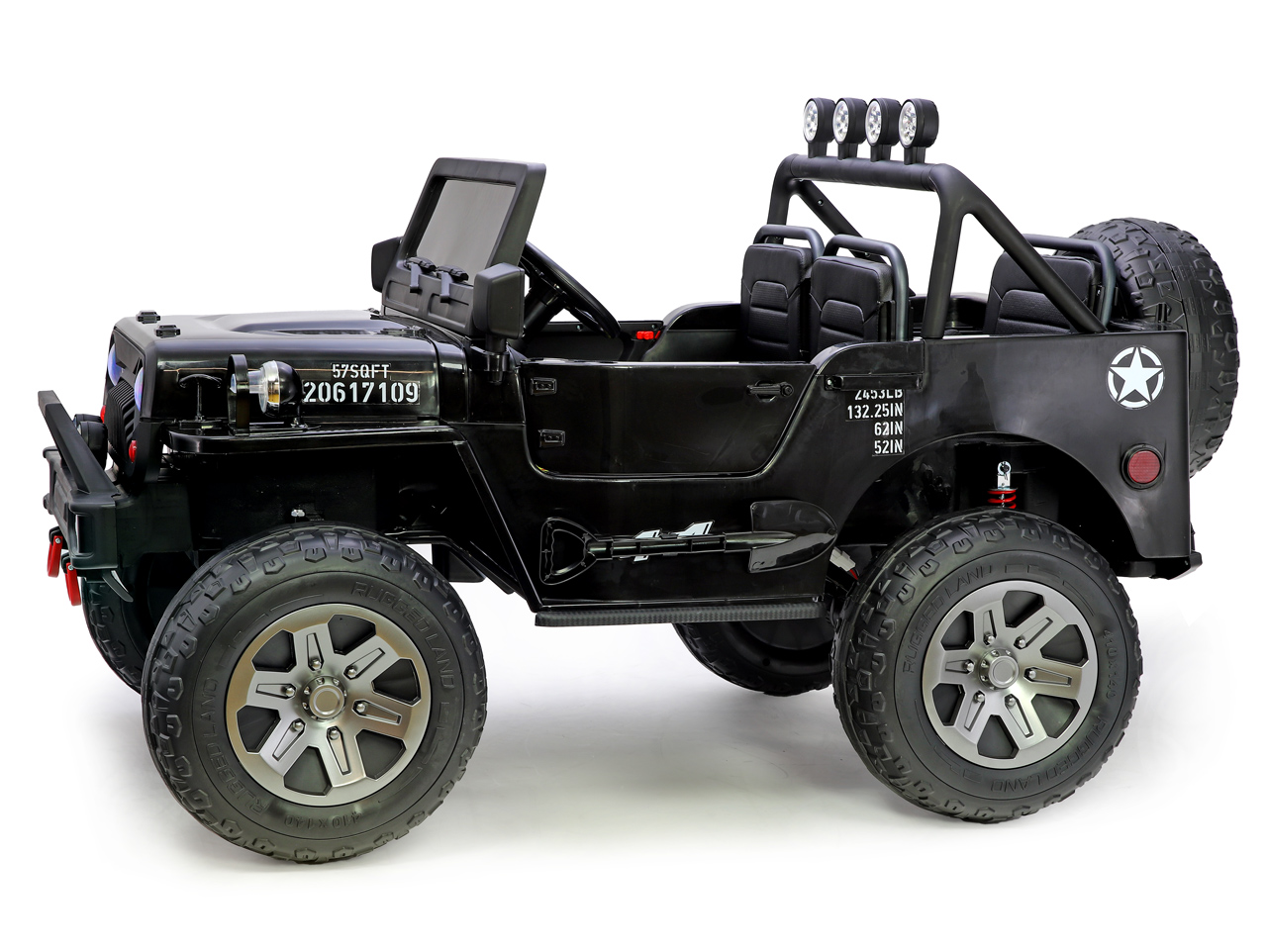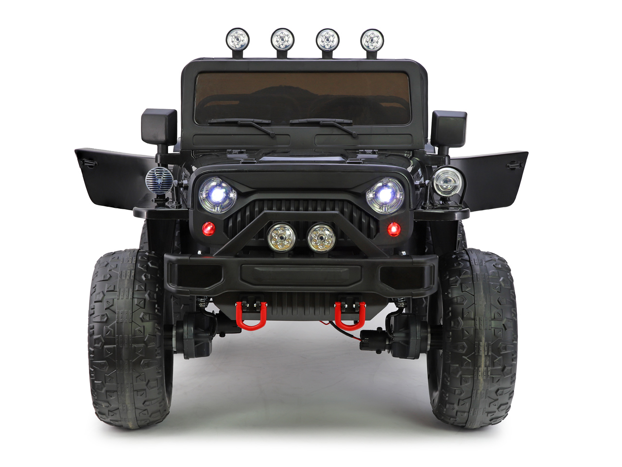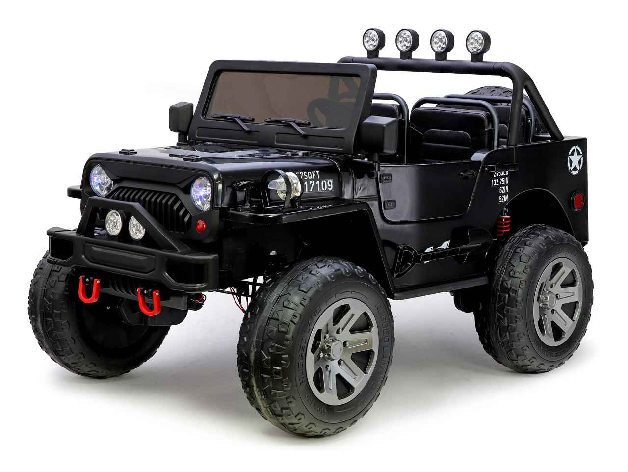 4 motory 24V/200W, 2 batérie 24V/7Ah spojené do 24V/14Ah, 2 rýchlosti na manuál / 3 na diaľkové ovládanie (2.4G), nosnosť 60 kg, plynulý rozjazd, veľké EVA kolesá so stredovými ložiskami, polstrované sedačky, odpruženie efekty, klaksón, predné LED svetlá, ukazovateľ stavu batérie, trojmiestny Celý popis