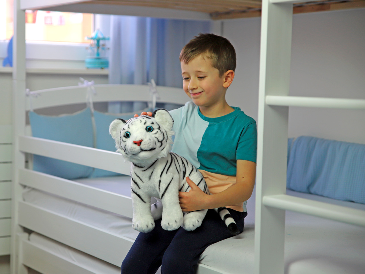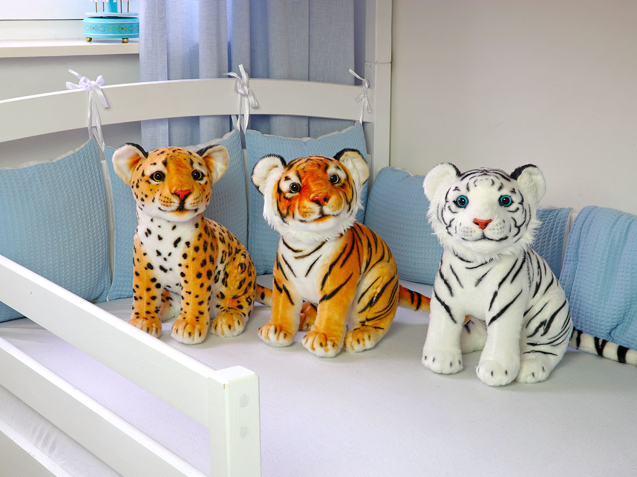 Už ste niekedy videli mačiatka bieleho tigra, ako sa hrajú? Ten pohľad je balzam na duši. Doprajte ho aj svojim ratolestiam. Modrými očkami, ružovým ňufákom a zvedavým inteligentným pohľadom vyzýva tento plyšový tigrík svojho malého majiteľa či majiteľku k hre alebo k maznaniu. Plyšového tigríka sme vyrobili z extra jemného plyšu , takže je na pohladenie jemnejšie ako bežné plyšové zvieratká. Ľahko umývateľný povrch z neho robí ideálneho spoločníka na cesty. To sa bude hodiť, pretože ho deti budú určite už od malička voziť všade so sebou. Vďaka stopercentne nezávadným materiálom , ktoré využívame pri výrobe, sa k nemu môžu túliť už najmenšie bábätká.