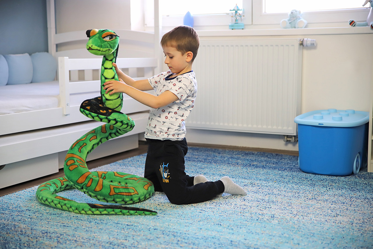 Svoje plyšáky vyrábame s láskou, dbáme na kvalitu a šijeme ich ručne . Preto ručíme za to, že budú vašim deťom robiť radosť dlho, nech už sa po nich budú váľať akokoľvek divoko. Obrovský plyšový had, ktorého sme pre jeho zamilovaný pohľad krásnych očí pomenovali Júlia, sa dokáže ovíjať okolo predmetov. Môže tak zdobiť pelesť detskej postieľky alebo sa omotať rovno okolo paničky či pána a poskytnúť tak dokonalý pocit z maznania. Inteligentným pohľadom krásnych očí priamo vyzýva deti, aby jej zverili všetky svoje stesky. Nezamrká, ale skoro to vyzerá, že áno.