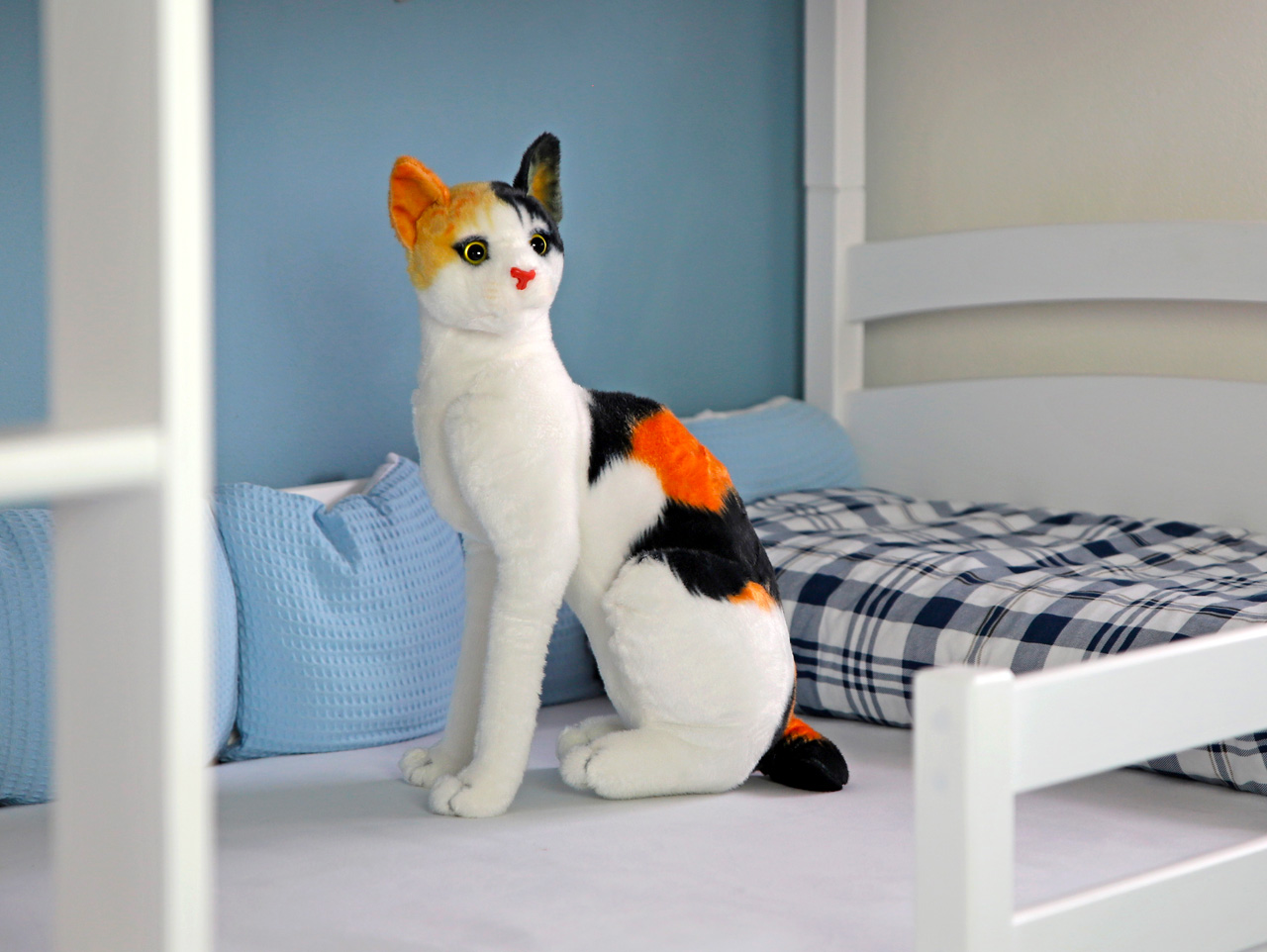 Starodávne mačacie plemeno manx poznáte ľahko podľa krátkeho guľovitého chvosta. Okrem chvosta, ktorého dĺžka a tvar sa líši podľa poddruhu plemena, vyzerá rovnako ako bežné európske mačky. Rovnako ako európske mačky je výborným lovcom a skvelým spoločníkom. Aj naša plyšová mačka bude verne sprevádzať svojho malého pána alebo paničku na výletoch. Keďže je jej srsť ľahko povrchovo umývateľná , po návrate z výpravy ju stačí utrieť vlhkou handričkou a môže sa veselo stúliť v detskej postieľke, kam patrí.