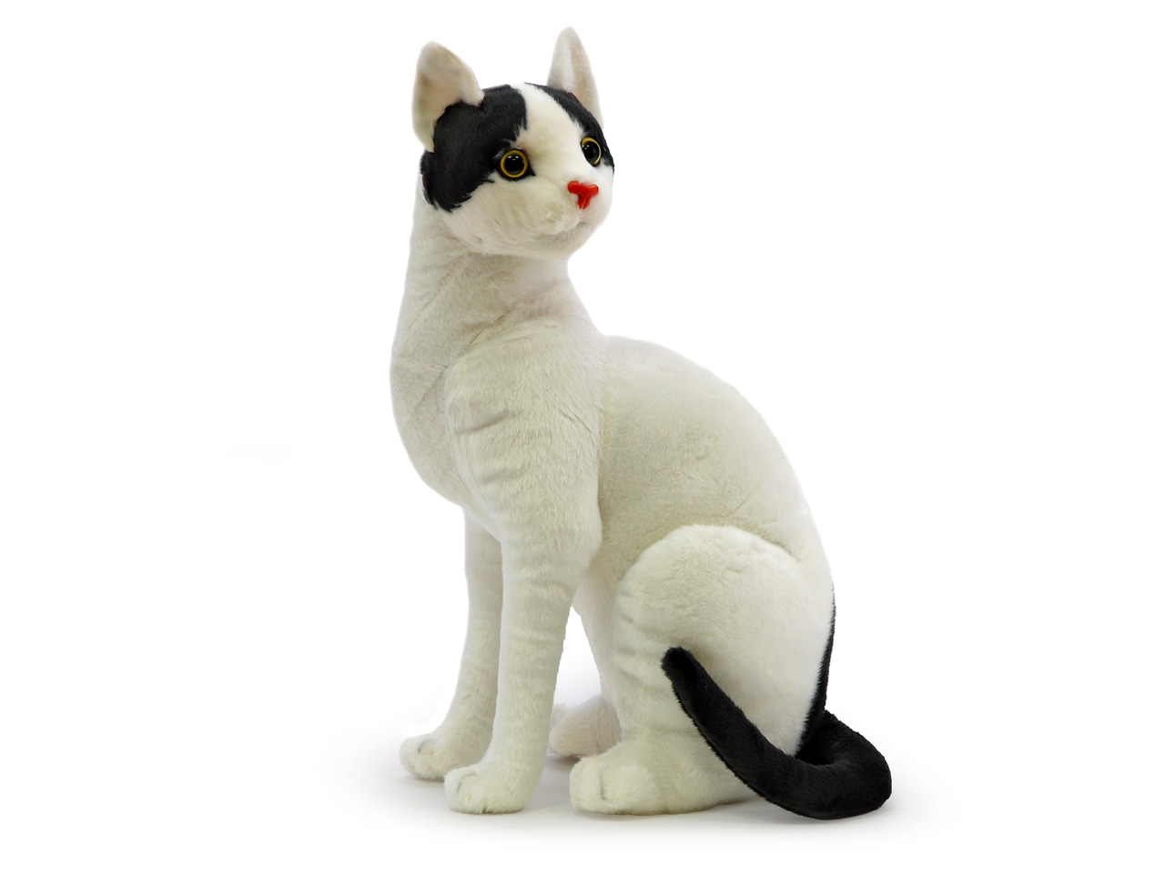 Naša plyšová mačka má pre plemeno turecká vaň typickú bielu farbu s maskou na hlave a tmavým dlhým chvostom. Rovnako ako jej veľký vzor si poradí s vodou, povrch stačí utrieť vlhkou handričkou. Malí pánikové alebo paničky si zamilujú predovšetkým jej zvedavý výraz žltých očí a červený ňufáčik. K hebkému kožúšku sa môžu bez obáv pritúliť už tie najmladšie deti , pretože pri výrobe zvieratiek používame výhradne úplne nezávadné materiály .
