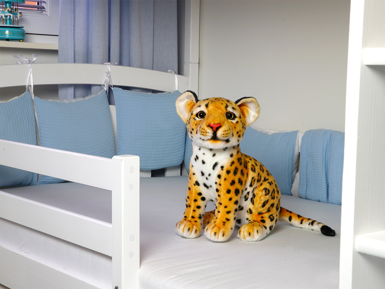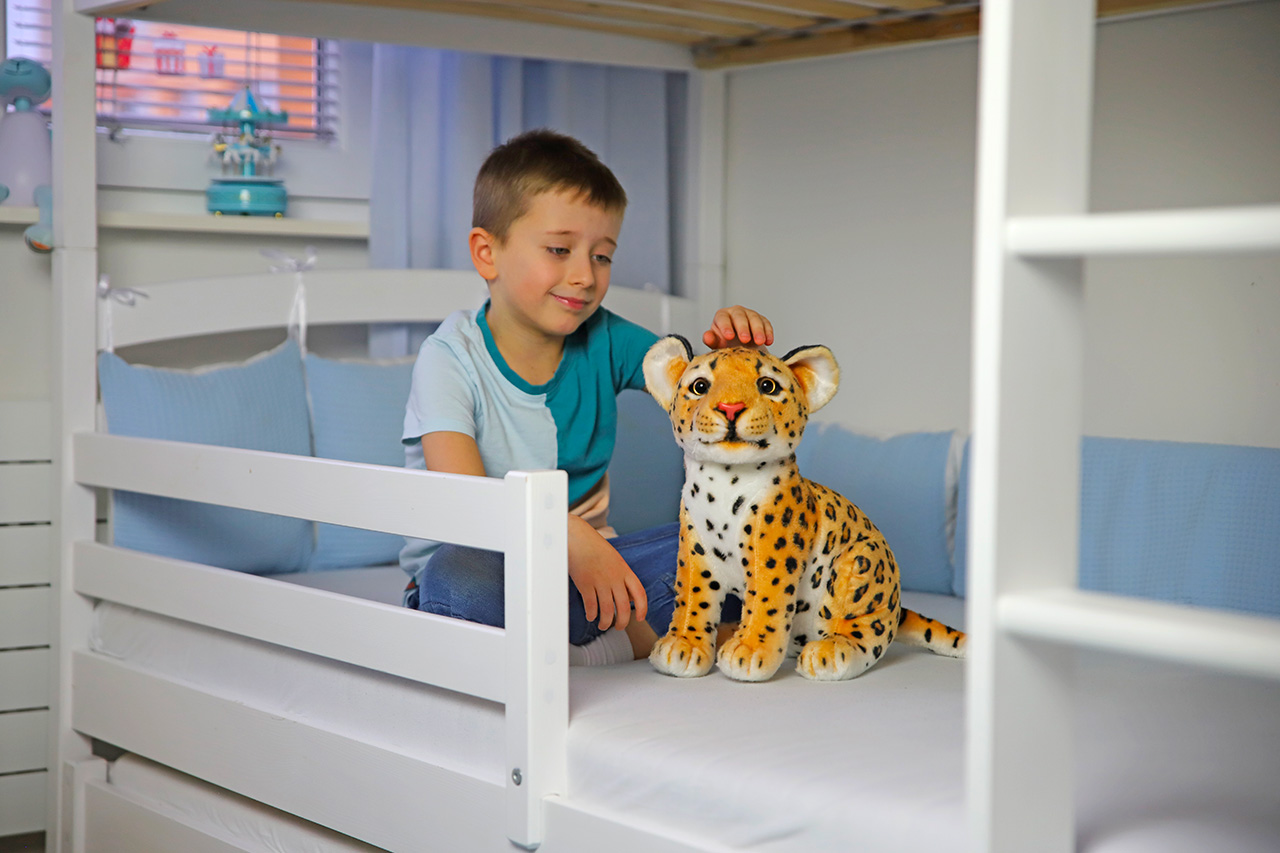 Náš malý plyšový leopard je neskutočne roztomilý . Jeho hnedé, zvedavé oči vyložene žiadajú o pohladenie. Keď k nemu natiahnete ruku, skoro čakáte, že zložia veľké okrúhle uši, aby vám rozšíril hladiacu plochu. Je to leopard každým coulom. Okrúhla hlava a veľké labky pripomínajú rozkošnú mačiatku neohrabanosť, zatiaľ čo pretiahnutý tvar sediaceho tela naznačuje, aká silná a pružná šelma by z neho mohla vyrásť. Nevyrastie, je totiž plyšový, a je to tak dobre. Pretože toto plyšové zvieratko z extra jemného plyšu a úplne nezávadných materiálov si na rozdiel od živého leoparda môžu pritúliť v postieľke už tie najmenšie deti .