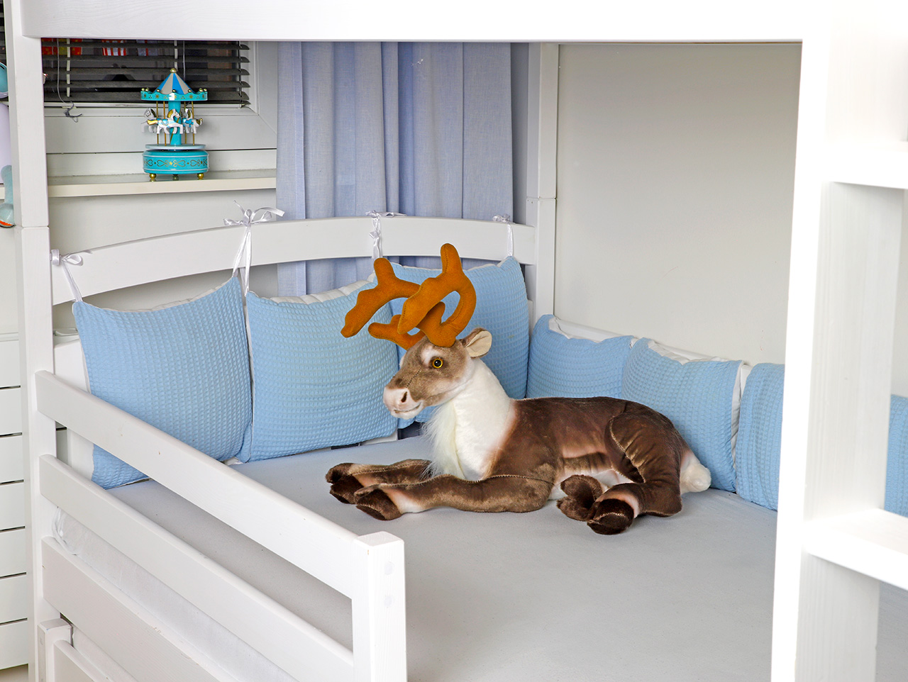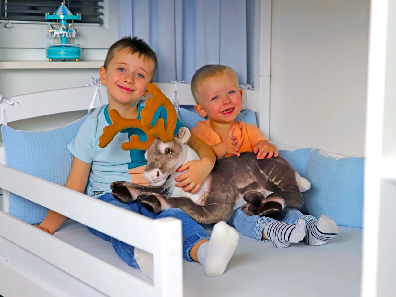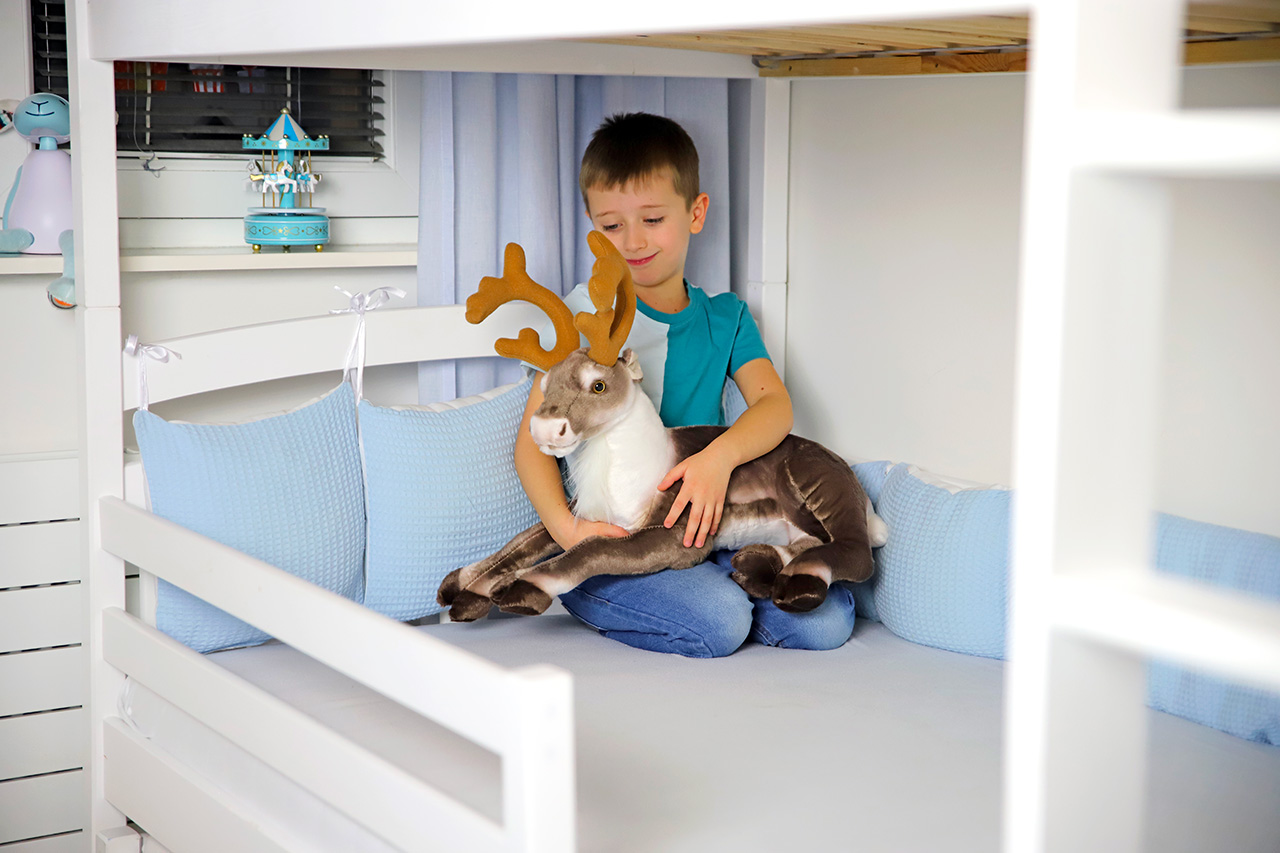 Veľký plyšový sob z našej kolekcie plyšová zoo je vernou kópiou skutočného soba polárneho. Má kopýtka s paznechtami aj výrazné parohy. A pretože najradšej trávia čas v detskej postieľke, tak uvoľnene leží s prednými nohami natiahnutými pred sebou. Veľký plyšový sob bude tiež skvelou dekoráciou do detskej izby . Väčšie deti si ho môžu pri hladení posadiť na klin, menšie bábätká ho napríklad objímu okolo krku a pritúlia sa. A pokiaľ si z jeho paroží urobia hryzátko, nič sa nestane. Vyrobili sme ho totiž z úplne nezávadných materiálov a celý povrch plyšového hračka soba je ľahko umývateľný . Stačí ho utrieť vlhkou handričkou.