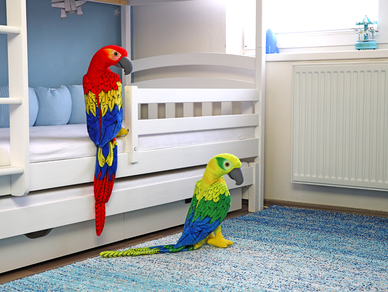 Náš nádherný plyšový papagáj je dokonalou napodobeninou skutočného ary šedolícího. Stane sa prvotriednou dekoráciou detskej izby , ale aj strážcom pokojného detského spánku a kamarátom na maznanie . Jeho múdry a inteligentný výraz v typickej tvári papagája ary naznačuje, že pozorne počúva všetky detské sny a nápady, ktoré často zamestnaní rodičia nestíhajú sledovať. Mäkký plyšový kožúšok opticky pripomína perie a pohladenie po zložených krídlach je tak rovnako upokojujúce ako hladenie skutočného papagája. V tomto prípade sa nemusíte zahnutého zobáka báť, papagáj príde v krabici už riadne ochočený a pripravený rovno sa usadiť na detskej posteli.